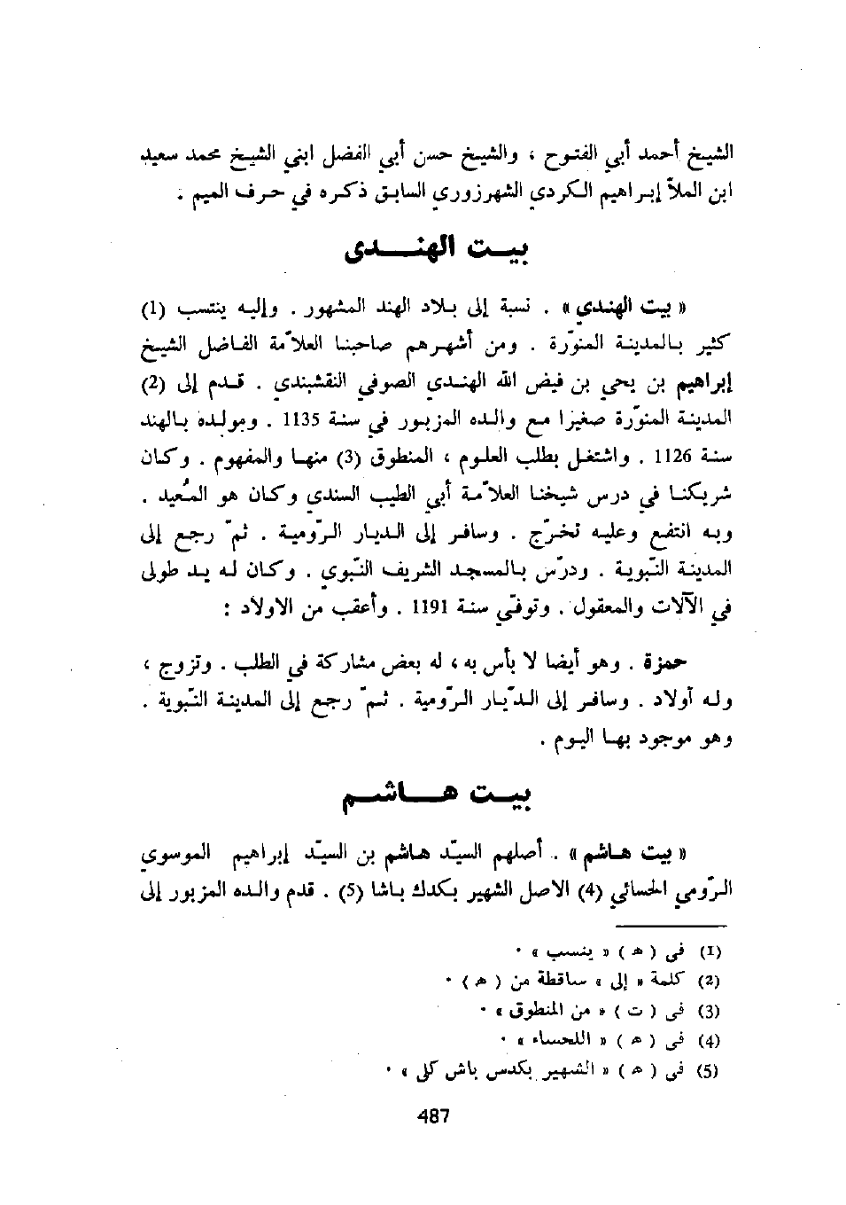 " بيت الهندي ". نسبة إلى بلاد الهند المشهور. وإليه ينتسب كثير بالمدينة المنورة. ومن أشهرهم صاحبنا العلامة الفاضل الشيخ إبراهيم بن يحي بن فيض الله الهندي الصوفي النقشبندي. قدم إلى المدينة المنورة صغيراً مع والده المزبور سنة 1135. ومولده بالهند سنة 1126. واشتغل بطلب العلوم، المنطوق منها والمفهوم. وكان شريكنا في درس شيخنا العلامة أبي الطيب السندي وكان هو المعيد. وبه انتفع وعليه تخرج. وسافر إلى الديار الرومية. ثم رجع إلى المدينة النبوية. ودرس بالمسجد الشريف النبوي. وكان له يد طولى في الأت والمعقول. وتوفي سنة 1191. وأعقب من الأولاد: حمزة. وهو أيضاً لا بأس به، له بعض مشاركة في الطلب. وتزوج، وله أولاد. وسافر إلى الديار الرومية. ثم رجع إلى المدينة النبوية. وهو موجود بها اليوم.
