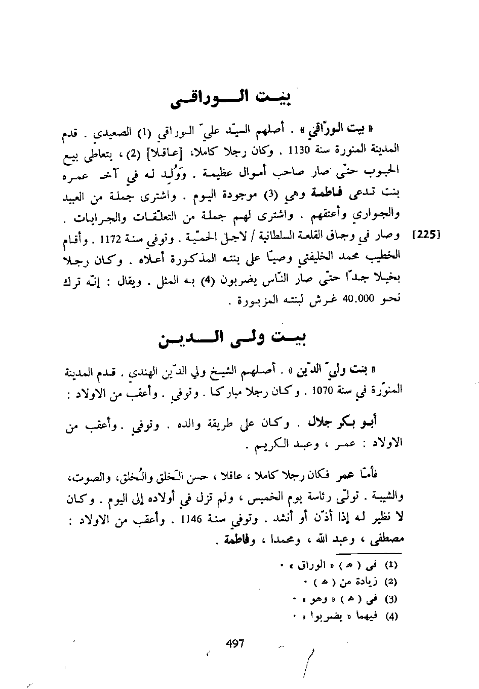 " بيت الوراقي ". أصلهم السيد علي الوراقي الصعيدي. قدم المدينة المنورة سنة 1130. وكان رجلاً كاملاً، " عاقلاً "، يتعاطى بيع الحبوب حتى صار صاحب أموال عظيمة. وولد له في آخر عمره بنت تدعى فاطمة وهي موجودة اليوم. واشترى جملة من العبيد والجواري وأعتقهم. واشترى لهم جملة من التعلقات والجرايات. وصار في وجاق القلعة السلطانية لأجل الحمية. وتوفي سنة 1172. وأقام الخطيب محمد الخليفتي وصياً على بنته المذكورة أعلاه. وكان رجلاً بخيلاً جداً حتى صار الناس يضربون به المثل. ويقال: إنه ترك نحو 40. 000 غرش لبنته المزبورة.