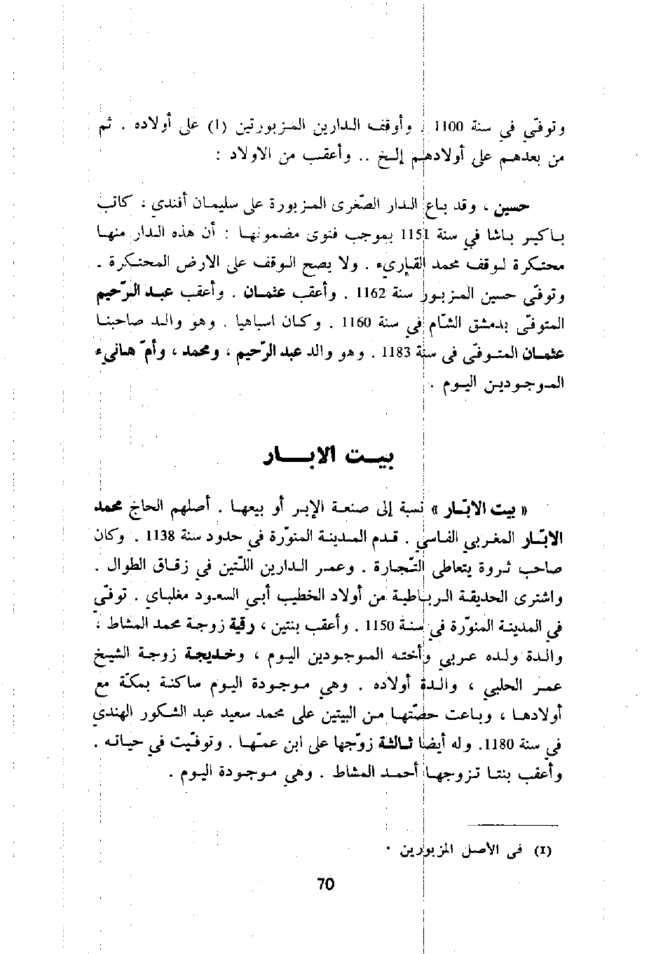 " بيت الأبار " نسبة إلى صنعة الإبر أو بيعها. أصلهم الحاج محمد الأبار المغربي الفاسي. قدم المدينة المنورة في حدود سنة 1138. وكان صاحب ثروة يتعاطى التجارة. وعمر الدارين اللتين في زقاق الطوال. واشترى الحديقة الرباطية من أولاد الخطيب أبي السعود مغلباي. توفي في المدينة المنورة في سنة 1150. وأعقب بنتين، رقية زوجة محمد المشاط، والدة ولده عربي وأخته الموجودين اليوم، وخديجة زوجة الشيخ عمر الحلبي، والدة أولاده. وهي موجودة اليوم ساكنة بمكة مع أولادها، وباعت حصتها من البيتين على محمد سعيد عبد الشكور الهندي في سنة 1180. وله أيضاً ثالثة زوجها على ابن عمها. وتوفيت في حياته. وأعقب بنتاً تزوجها أحمد المشاط. وهي موجودة اليوم.