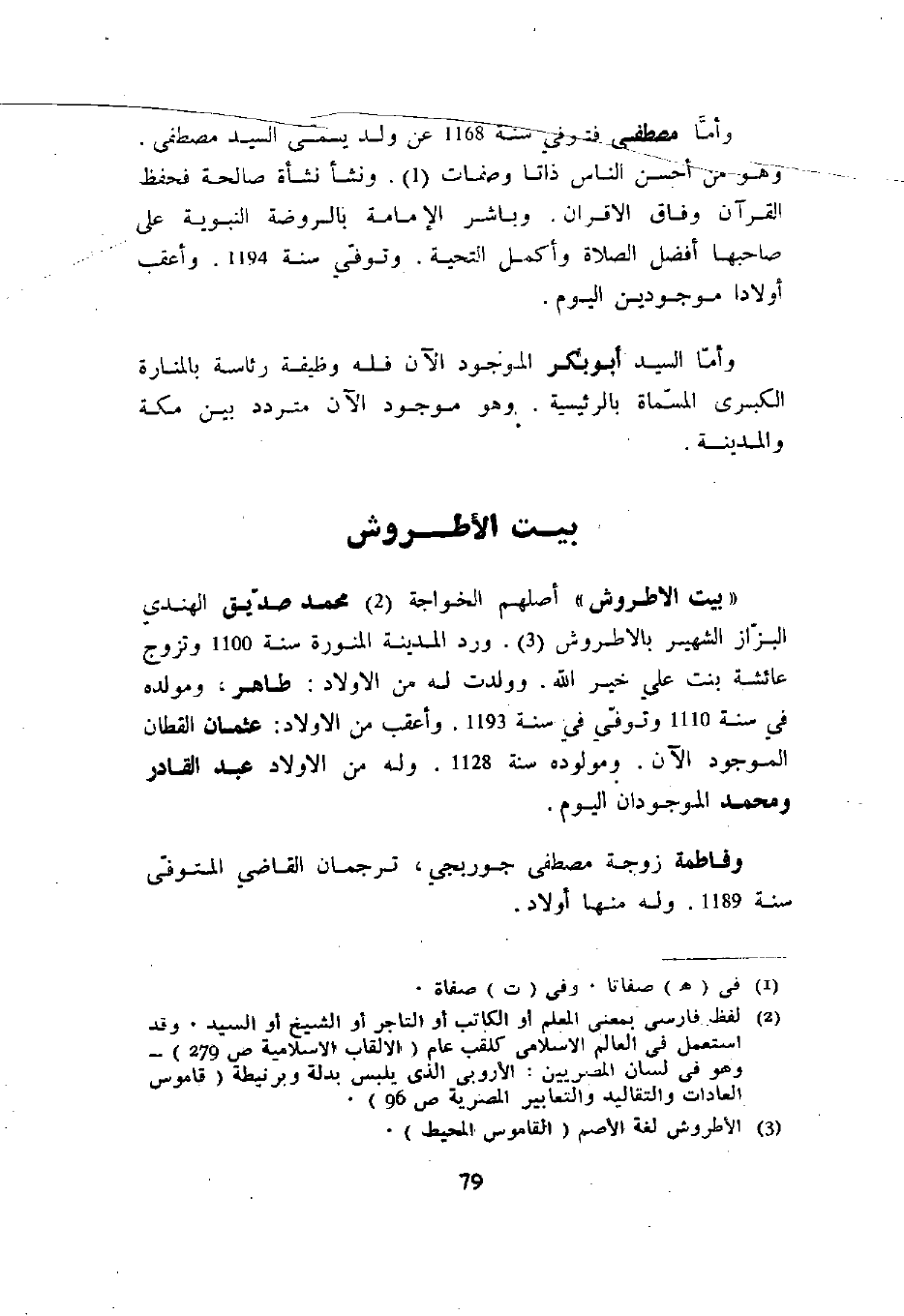 وأما مصطفى فتوفي سنة 1168 عن ولد يسمى السيد مصطفى. وهو من احسن الناس ذاتاً وصفات. ونشأ نشأة صالحة فحفظ القرآن وفاق الأقران. وباشر الإمامة بالروضة النبوية على صاحبها أفضل الصلاة وأكمل التحية. وتوفي سنة 1194. وأعقب أولاداً موجودين اليوم.