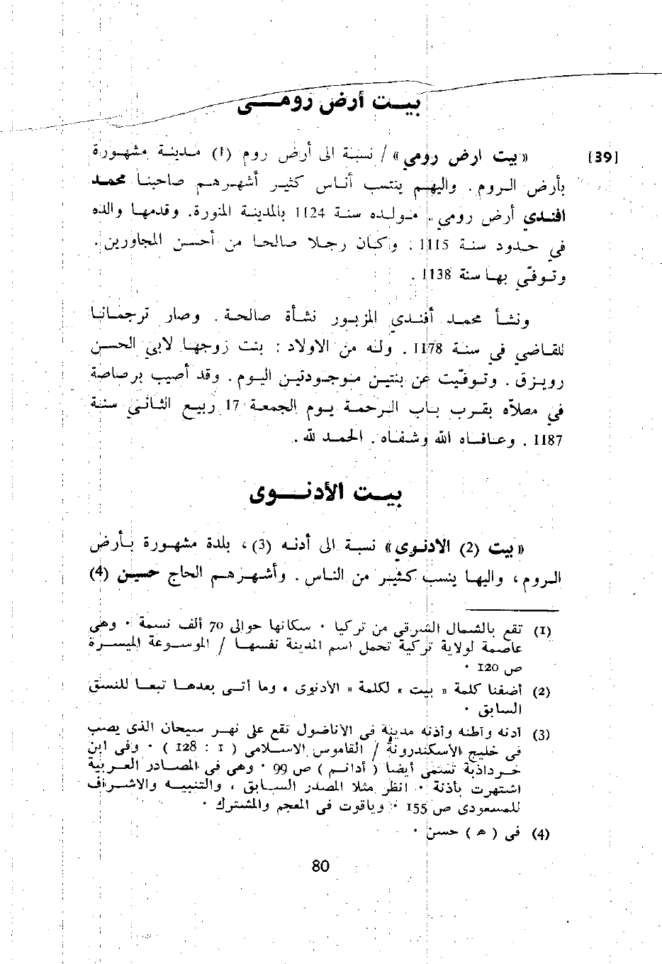 " بيت أرض رومي " نسبة إلى أرض روم مدينة مشهورة بأرض الروم. وإليهم ينتسب أناس كثير أشهرهم صاحبنا محمد أفندي أرض رومي. مولده سنة 1124 بالمدينة المنورة. وقدمها والده في حدود سنة 1115. وكان رجلاً صالحاً من أحسن المجاورين. وتوفي بها سنة 1138.