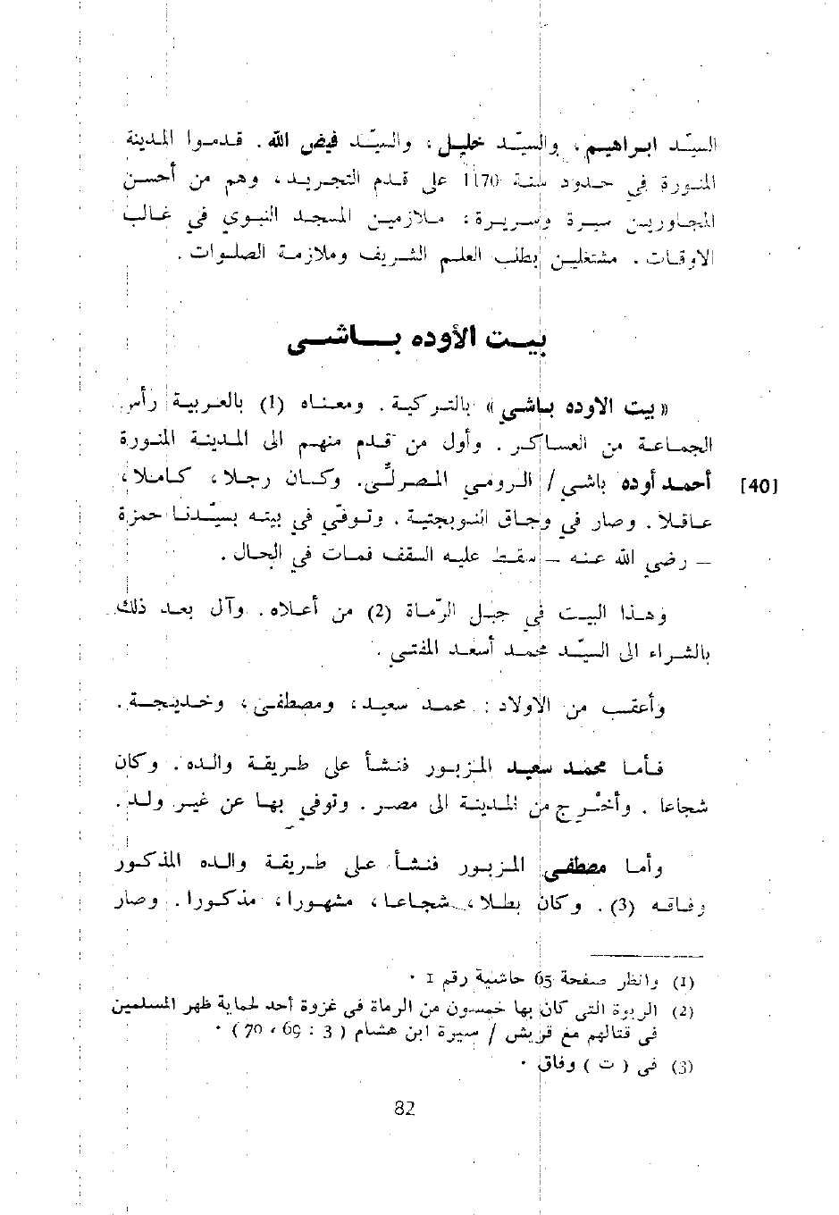 " بيت الأوده باشي " بالتركية. ومعناه بالعربية رأس الجماعة من العساكر. وأول من قدم منهم المدينة المنورة أحمد أوده باش الرومي المصرلي. وكان رجلاً، كاملاً، عاقلاً. وصار في وجاق النوبجتية. وتوفي في بيته بسيدنا حمزة - رضي الله عنه - سقط عليه السقف فمات في الحال.