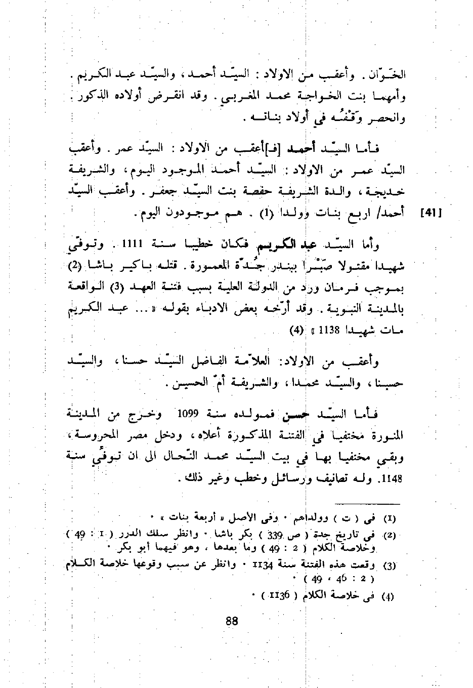 فأما السيد حسن فمولده سنة 1099 وخرج من المدينة المنورة مختفياً في الفتنة المذكورة أعلاه، ودخل مصر المحروسة، وبقي مختفياً بها في بيت السيد محمد النحال إلى أن توفي سنة 1148. وله تصانيف ورسائل وخطب وغير ذلك.
