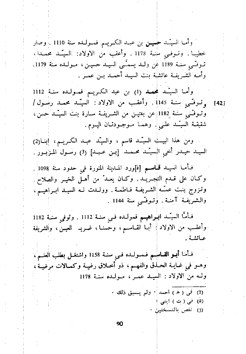 فأما السيد قاسم " ف " ورد المدينة المنورة في حدود سنة 1098. وكان على قدم التجريد. وكان يعد من أهل الخير والصلاح. وتزوج بنت عمه الشريفة فاطمة. وولدت له السيد إبراهيم، والشريفة آمنة. وتوفي سنة 1144.