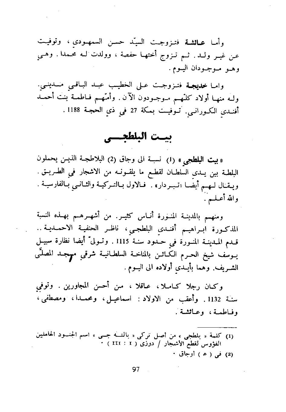 ومنهم بالمدينة المنورة أناس كثير. من أشهرهم بهذه النسبة المذكورة إبراهيم أفندي البلطجي، ناظر الحنفية الأحمدية.. قدم المدينة المنورة في حدود سنة 1115. وتولى أيضاً نظارة سبيل يوسف شيخ الحرم الكائن بالمناخة السلطانية شرقي مسجد المصلى الشريف. وهما بأيدي أولاده إلى اليوم.