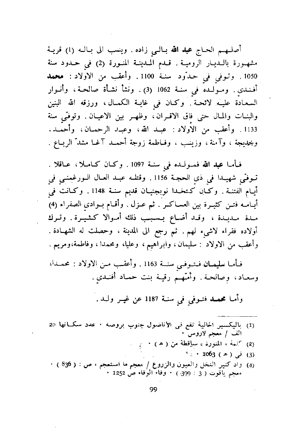 فأما عبد الله فمولده في سنة 1097. وكان كاملاً، عاقلاً. توفي شهيداً في ذي الحجة 1156. وقتله عبد العال الورغمني في أيام الفتنة. وكان كتخدا نوربجتيان قديم سنة 1148. وكانت في أيامه فتن كثيرة بين العساكر. ثم عزل. وأقام بوادي الصفراء مدة مديدة، وقد أضاع بسبب ذلك أموالاً كثيرة. وترك أولاده فقراء لا شيء لهم. ثم رجع إلى المدينة، وحصلت له الشهادة. وأعقب من الأولاد: سليمان، وإبراهيم، وعلياً، ومحمداً، وفاطمة، ومريم.