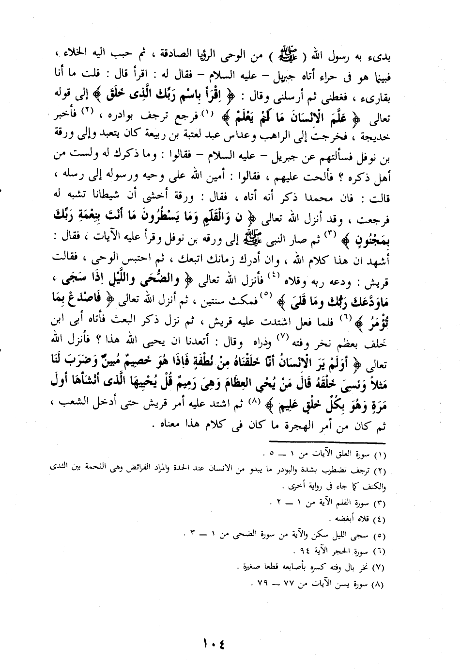 بدىء به رسول الله (صلّى الله عليه وسلم) من الوحى الرؤيا الصادقة، ثم حبب اليه الخلاء، فبينما هو فى حراء أتاه جبريل- عليه السّلام- فقال له: اقرأ قال: قلت ما أنا بقارىء، فغطنى ثم أرسلنى وقال: اقْرَأْ بِاسْمِ رَبِّكَ الَّذِي خَلَقَ