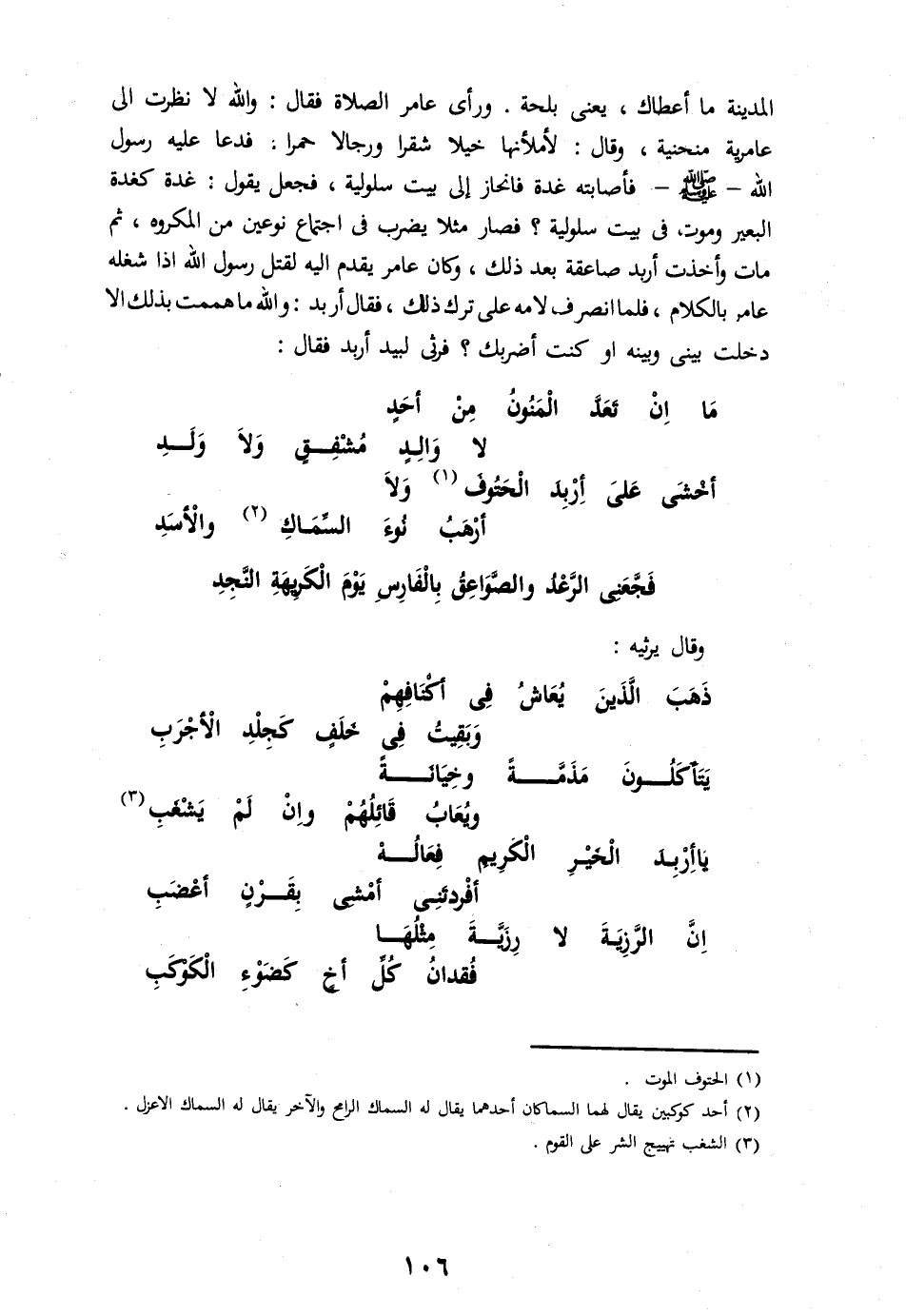 المدينة ما أعطاك، يعنى بلحة. ورأى عامر الصلاة فقال: والله لا نظرت الى عامرية منحنية، وقال: لأملأنها خيلا شقرا ورجالا حمرا. فدعا عليه رسول الله- صلّى الله عليه وسلم- فأصابته غدة فانحاز إلى بيت سلولية، فجعل يقول: غدة كغدة البعير وموت فى بيت سلولية؟ فصار مثلا يضرب فى اجتماع نوعين من المكروه، ثم مات وأخذت أربد صاعقة بعد ذلك، وكان عامر يقدم اليه لقتل رسول الله اذا شغله عامر بالكلام، فلما انصرف لامه على ترك ذلك، فقال أربد: والله ما هممت بذلك الا دخلت بينى وبينه او كنت أضربك؟ فرثى لبيد أربد فقال: