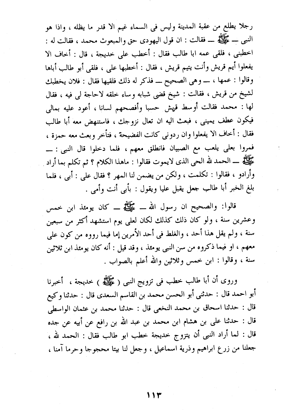قالوا: والصحيح ان رسول الله- صلّى الله عليه وسلم- كان يومئذ ابن خمس وعشرين سنة، ولو كان ذلك كذلك لكان لعلى يوم استشهد أكثر من سبعين سنة، ولم يقل هذا أحد، والغلط فى أحد الأمرين إما فيما رووه من كون على معهم، او فيما ذكروه من سن النبى يومئذ، وقد قيل: أنه كان يومئذ ابن ثلاثين سنة، وقالوا: ابن خمس وثلاثين والله أعلم بالصواب.