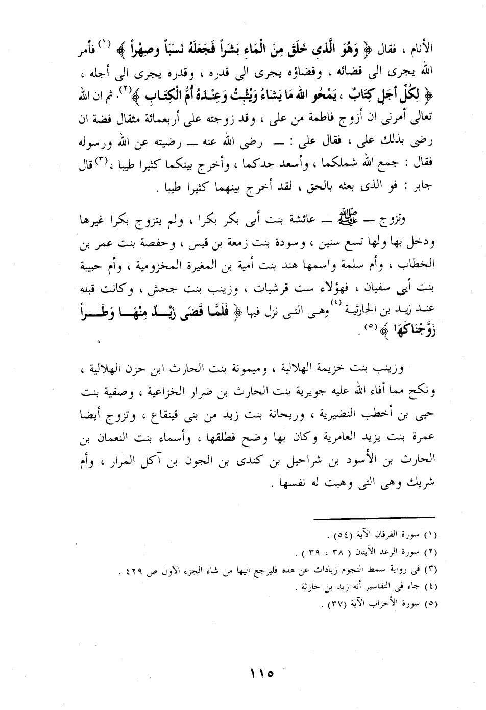 وتزوج- صلّى الله عليه وسلم- عائشة بنت أبى بكر بكرا، ولم يتزوج بكرا غيرها ودخل بها ولها تسع سنين، وسودة بنت زمعة بن قيس، وحفصة بنت عمر بن الخطاب، وأم سلمة واسمها هند بنت أمية بن المغيرة المخزومية، وأم حبيبة بنت أبى سفيان، فهؤلاء ست قرشيات، وزينب بنت جحش، وكانت قبله عند زيد بن الحارثية «4» وهى التى نزل فيها فَلَمَّا قَضى زَيْدٌ مِنْها وَطَراً زَوَّجْناكَها