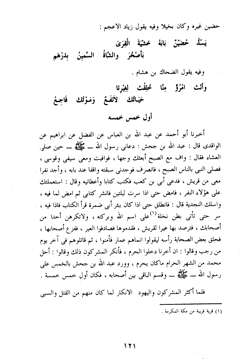 أخبرنا أبو أحمد عن عبد الله بن العباس عن الفضل عن ابراهيم عن الواقدى قال: عبد الله بن جحش: دعانى رسول الله- صلّى الله عليه وسلم- حين صلّى العشاء فقال: واف مع الصبح أبعثك وجها، فوافيت ومعى سيفى وقوسى، فصلّى النبى بالناس الصبح، فانصرف فوجدنى سبقته واقفا عند بابه، وأجد نفرا معى من قريش، فدعى أبى بن كعب فكتب كتابا وأعطانيه وقال: استعملتك على هؤلاء النفر، فامض حتى اذا سرت ليلتين فانشر كتابى ثم امض لما فيه، واسلك النجدية قال: فانطلق حتى اذا كان ببئر أبى ضمرة قرأ الكتاب فاذا فيه، سر حتى تأتى بطن نخلة «1» على اسم الله وبركته، ولا تكرهن أحدا من أصحابك، فترصد بها عيرا لقريش، فقدموها فصادفوا العير، ففزع أصحابها، فحلق بعض الصحابة رأسه ليقولوا انماهم عمار فأمنوا، ثم قاتلوهم فى آخر يوم من رجب وقالوا: ان أخرنا دخلوا الحرم، فأنكر المشركون ذلك وقالوا: أحل محمد من الشهر الحرام ما كان يحرم، وورد عبد الله بن جحش بالخمس على رسول الله- صلّى الله عليه وسلم- وقسم الباقى بين أصحابه، فكان أول خمس خمسة.