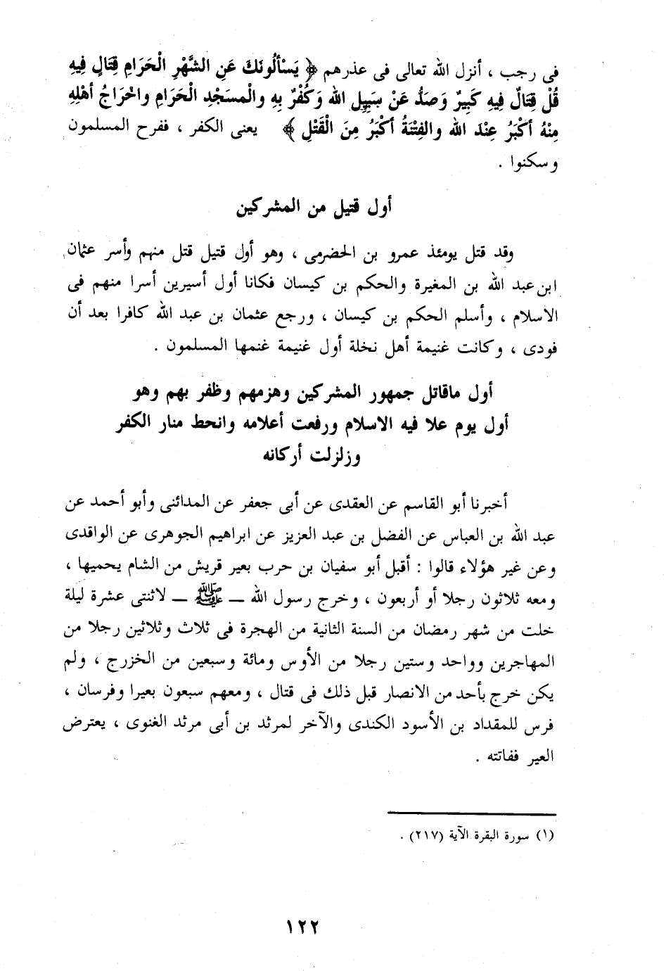 فى رجب، أنزل الله تعالى فى عذرهم يَسْئَلُونَكَ عَنِ الشَّهْرِ الْحَرامِ قِتالٍ فِيهِ قُلْ قِتالٌ فِيهِ كَبِيرٌ وَصَدٌّ عَنْ سَبِيلِ اللَّهِ وَكُفْرٌ بِهِ وَالْمَسْجِدِ الْحَرامِ وَإِخْراجُ أَهْلِهِ مِنْهُ أَكْبَرُ عِنْدَ اللَّهِ وَالْفِتْنَةُ أَكْبَرُ مِنَ الْقَتْلِ