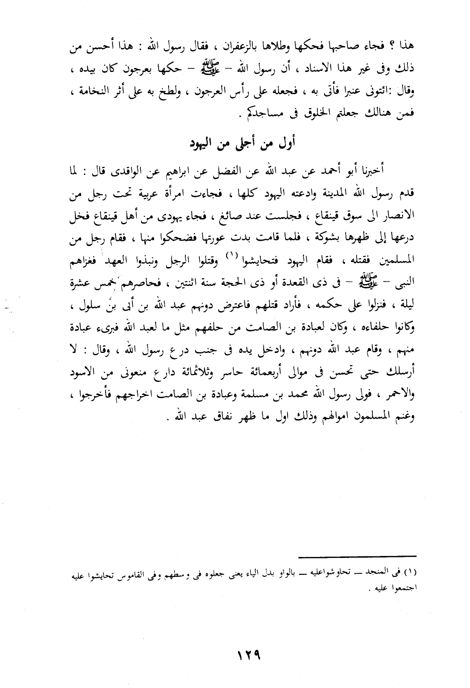 أخبرنا أبو أحمد عن عبد الله عن الفضل عن ابراهيم عن الواقدى قال: لما قدم رسول الله المدينة وادعته اليهود كلها، فجاءت امرأة عربية تحت رجل من الانصار الى سوق قينقاع، فجلست عند صائغ، فجاء يهودى من أهل قينقاع فخل درعها إلى ظهرها بشوكة، فلما قامت بدت عورتها فضحكوا منها، فقام رجل من المسلمين فقتله، فقام اليهود فتحايشوا «1» وقتلوا الرجل ونبذوا العهد فغزاهم النبى- صلّى الله عليه وسلم- فى ذى القعدة أو ذى الحجة سنة اثنتين، فحاصرهم خمس عشرة ليلة، فنزلوا على حكمه، فأراد قتلهم فاعترض دونهم عبد الله بن أبى بن سلول، وكانوا حلفاءه، وكان لعبادة بن الصامت من حلفهم مثل ما لعبد الله فبرىء عبادة منهم، وقام عبد الله دونهم، وادخل يده فى جنب درع رسول الله، وقال: لا أرسلك حتى تحسن فى موالى أربعمائة حاسر وثلاثمائة دارع منعونى من الاسود والاحمر، فولى رسول الله محمد بن مسلمة وعبادة بن الصامت اخراجهم فأخرجوا، وغنم المسلمون اموالهم وذلك اول ما ظهر نفاق عبد الله.