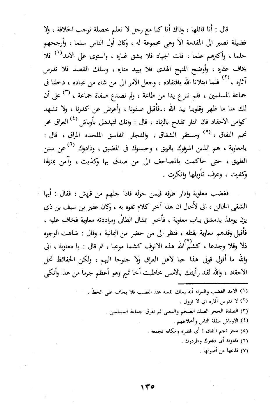 يا معاوية، هم الذين اشرقوك بالريق، وحبسوك فى المضيق، وذادوك «6» عن سنن الطريق، حتى حاكمت بالمصاحف الى من صدق بها وكذبت، وآمن بمنزلها وكفرت، وعرف تأويلها وانكرت.