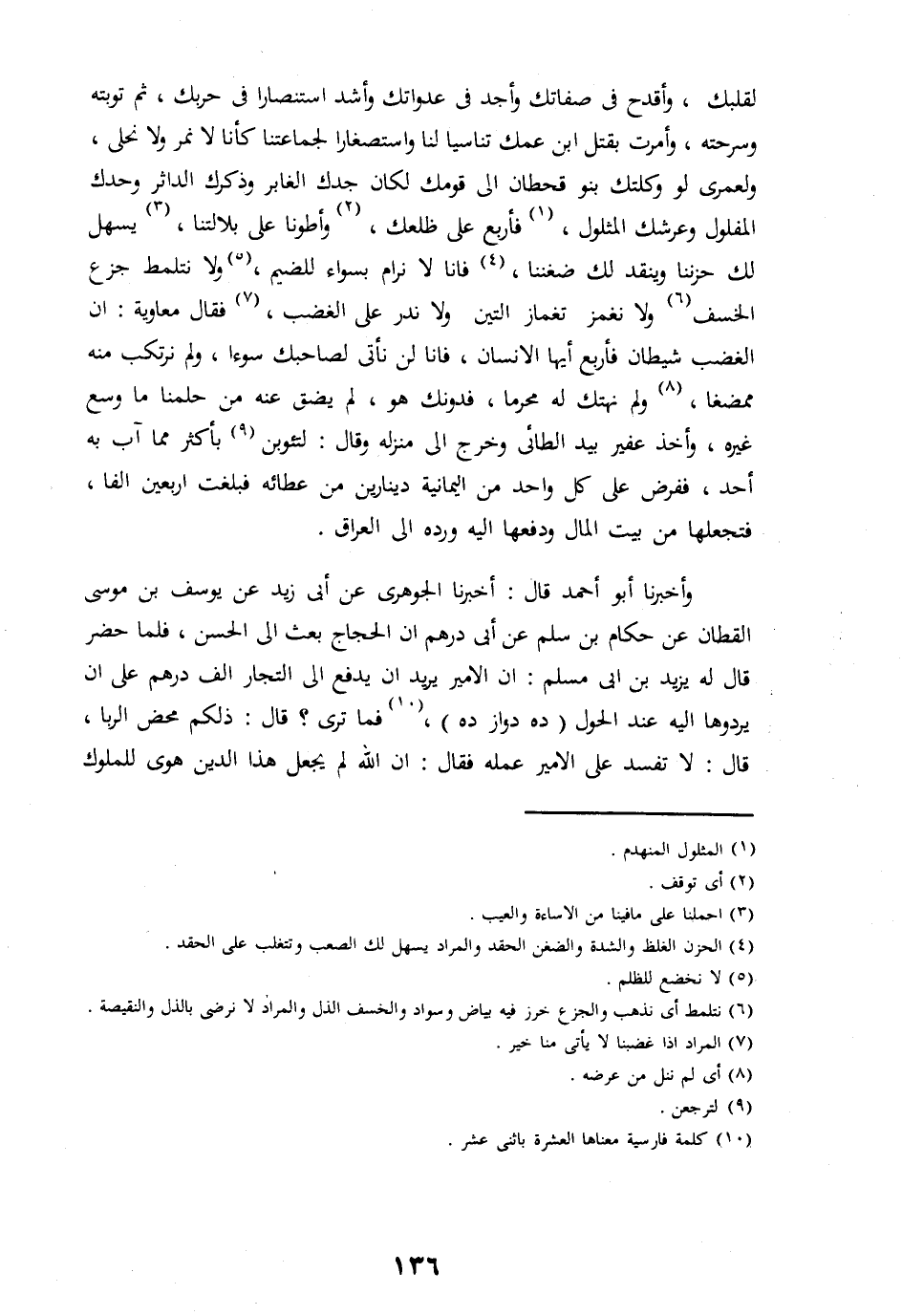 وأخبرنا أبو أحمد قال: أخبرنا الجوهرى عن أبى زيد عن يوسف بن موسى القطان عن حكام بن سلم عن أبى درهم ان الحجاج بعث الى الحسن، فلما حضر قال له يزيد بن ابى مسلم: ان الامير يريد ان يدفع الى التجار الف درهم على ان يردوها اليه عند الحول (ده دوازده) ، «10» فما ترى؟ قال: ذلكم محض الربا، قال: لا تفسد على الامير عمله فقال: ان الله لم يجعل هذا الدين هوى للملوك