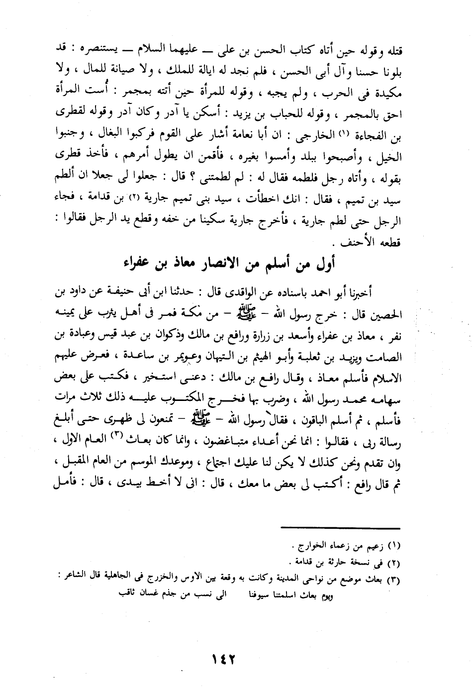 أخبرنا أبو امد باسناده عن الواقدى قال: حدثناابن أبى حنيفة عن داود بن الحصين قال: خرج رسول الله- صلّى الله عليه وسلم- من مكة فمر فى أهل يثرب على يمينه نفر، معاذ بن عفراء وأسعد بن زرارة ورافع بن مالك وذكوان بن عبد قيس وعبادة بن الصامت ويزيد بن ثعلبة وأبو الهيثم بن التيهن وعويمر بن ساعدة، فعرض عليهم الاسلام فأسلم معاذ، وقال رافع بن مالك: دعنى استخير، فكتب على بعض سهامه محمد رسول الله، وضرب بها فخرج المكتوب عليه ذلك ثلاث مرات فأسلم، ثم أسلم الباقون، فقال رسول الله- صلّى الله عليه وسلم- تمنعون لى ظهرى حتى أبلغ رسالة ربى، فقالوا: انما نحن أعداء متباغضون، وانما كان بعاث «3» العام الاول، وان تقدم ونحن كذلك لا يكن لنا عليك اجتماع، وموعدك الموسم من العام المقبل، ثم قال رافع: أكتب لى بعض ما معك، قال: انى لا أخط بيدى، قال: فأمل