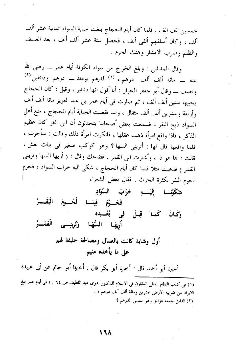 وقال المدائنى: وبلغ الخراج من سواد الكوفة أيام عمر- رضى الله عنه- مائة ألف ألف درهم، «1» الدرهم يومئذ- درهم ودانقين «2» ونصف- وقال أبو جعفر الحرار: أنا أقول انها دنانير، وقيل: كان الحجاج يجبيها ستين ألف ألف، ثم صارت فى أيام عمر بن عبد العزيز مائة ألف ألف وأربعة وعشرين ألف ألف مثقال، ولما نقصت الجباية أيام الحجاج، منع أهل السواد ذبح البقر، فسمعت بعض أصحابنا يتحدثون أن ابن الغز كان عظيم الذكر، فاذا واقع امرأة ذهب عقلها، فانكرت امرأة ذلك وقالت: سأجرب، فلما واقعها قال لها: أترينى السها؟ وهو كوكب صغير فى بنات نعش، قالت: ها هو ذا، وأشارت الى القمر. فضحك وقال: (أريها السها وترينى القمر) فذهبت مثلا فلما كان أيام الحجاج، شكى اليه خراب السواد، فحرم لحوم البقر لكثرة الحرث. فقال بعض الشعراء