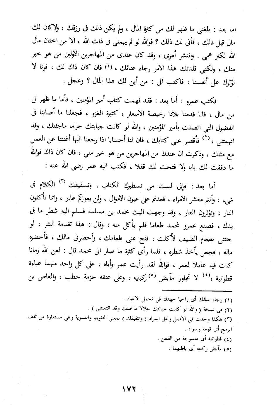 أما بعد: فإنى لست من تسطيرك الكتاب، وتسقيفك «3» الكلام فى شىء، وأنتم معشر الامراء، قعدتم على عيون الاموال، ولن يعوزكم عذر، وانما تأكلون النار، وتؤثرون العار، وقد وجهت اليك محمد بن مسلمة فسلم اليه شطر ما فى يدك، فصنع عمرو لمحمد طعاما فلم يأكل منه، وقال: هذا تقدمة الشر، لو جئتنى بطعام الضيف لأكلت، فنح عنى طعامك، وأحضرنى مالك، فأحضره ماله، فجعل يأخذ شطره، فلما رأى كثرة ما صار الى محمد قال: لعن الله زمانا كنت فيه عاملا لعمر، فو الله لقد رأيت عمر وأباه، على كل واحد منهما عباءة قطوانية، «4» لا تجاوز مآبض «5» ركبتيه، وعلى عنقه حزمة حطب، والعاص بن
