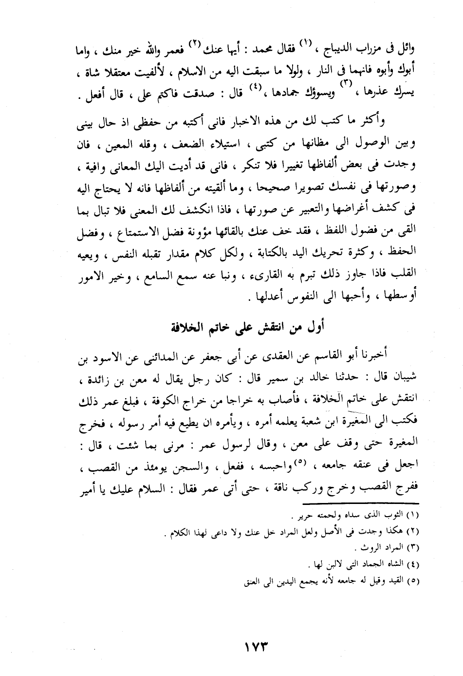 وأكثر ما كتب لك من هذه الاخبار فانى أكتبه من حفظى اذ حال بينى وبين الوصول الى مظانها من كتبى، استيلاء الضعف، وقله المعين، فان وجدت فى بعض ألفاظها تغييرا فلا تنكر، فانى قد أديت اليك المعانى وافية، وصورتها فى نفسك تصويرا صحيحا، وما ألقيته من ألفاظها فانه لا يحتاج اليه فى كشف أغراضها والتعبير عن صورتها، فاذا انكشف لك المعنى فلا تبال بما القى من فضول اللفظ، فقد خف عنك بالقائها مؤونة فضل الاستمتاع، وفضل الحفظ، وكثرة تحريك اليد بالكتابة، ولكل كلام مقدار تقبله النفس، ويعيه القلب فاذا جاوز ذلك تبرم به القارىء، ونبا عنه سمع السامع، وخير الامور أوسطها، وأحبها الى النفوس أعدلها.