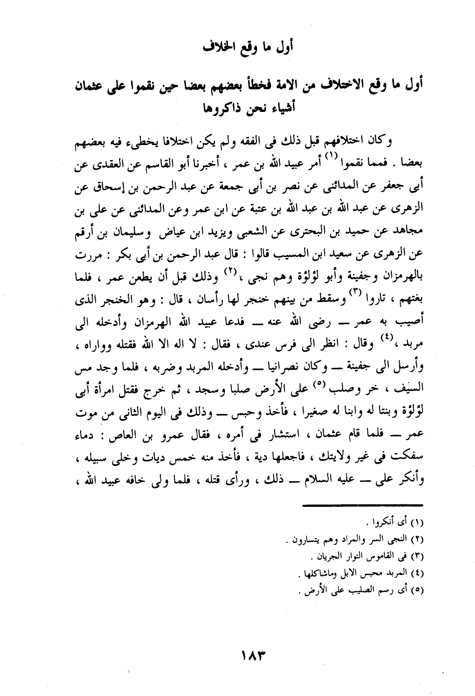 وكان اختلافهم قبل ذلك فى الفقه ولم يكن اختلافا يخطىء فيه بعضهم بعضا. فمما نقموا «1» أمر عبيد الله بن عمر، أخبرنا أبو القاسم عن العقدى عن أبى جعفر عن المدائنى عن نصر بن أبى جمعة عن عبد الرحمن بن إسحاق عن الزهرى عن عبد الله بن عبد الله بن عتبة عن ابن عمر وعن المدائنى عن على بن مجاهد عن حميد بن البحترى عن الشعبى ويزيد ابن عياض وسليمان بن أرقم عن الزهرى عن سعيد ابن المسيب قالوا: قال عبد الرحمن بن أبى بكر: مررت بالهرمزان وجفينة وأبو لؤلؤة وهم نجى، «2» وذلك قبل أن يطعن عمر، فلما بغتهم، تاروا «3» وسقط من بينهم خنجر لها رأسان، قال: وهو الخنجر الذى أصيب به عمر- رضى الله عنه- فدعا عبيد الله الهرمزان وأدخله الى مربد، «4» وقال: انظر الى فرس عندى، فقال: لا اله الا الله فقتله وواراه، وأرسل الى جفينة- وكان نصرانيا- وأدخله المربد وضربه، فلما وجد مس السيف، خر وصلب «5» على الأرض صلبا وسجد، ثم خرج فقتل امرأة أبى لؤلؤة وبنتا له وابنا له صغيرا، فأخذ وحبس- وذلك فى اليوم الثانى من موت عمر- فلما قام عثمان، استشار فى أمره، فقال عمرو بن العاص: دماء سفكت فى غير ولايتك، فاجعلها دية، فأخذ منه خمس ديات وخلى سبيله، وأنكر على- عليه السلام- ذلك، ورأى قتله، فلما ولى خافه عبيد الله،