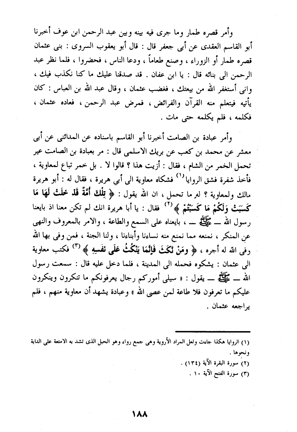 «3» فكتب معاوية الى عثمان: يشكوه فحمله الى المدينة، فلما دخل عليه قال: سمعت رسول الله- صلّى الله عليه وسلم- يقول: «سيلى أموركم رجال يعرفونكم ما تنكرون وينكرون عليكم ما تعرفون فلا طاعة لمن عصى الله» وعبادة يشهد أن معاوية منهم، فلم يراجعه عثمان.