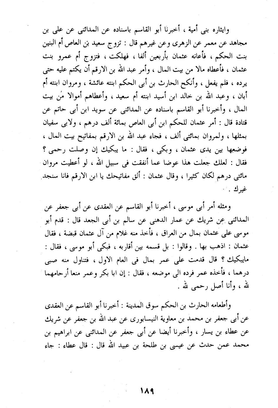 ومثله أمر أبى موسى، أخبرنا أبو القاسم عن العقدى عن أبى جعفر عن المدائنى عن شريك عن عمار الدهنى عن سالم بن أبى الجعد قال: قدم أبو موسى على عثمان بمال من العراق، فأخذ منه غلام من آل عثمان قبضة، فقال عثمان: اذهب بها. وقالوا: بل قسمه بين أقاربه، فبكى أبو موسى، فقال: