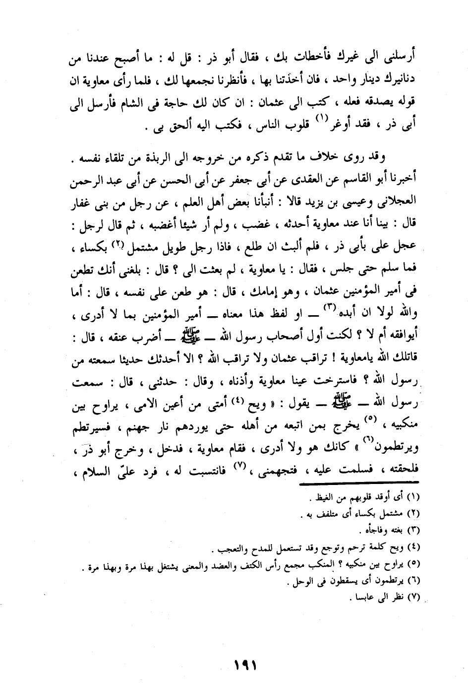 عجل على بأبى ذر، فلم ألبث ان طلع، فاذا رجل طويل مشتمل «2» بكساء، فما سلم حتى جلس، فقال: يا معاوية، لم بعثت الى؟ قال: بلغنى أنك تطعن فى أمير المؤمنين عثمان، وهو إمامك، قال: هو طعن على نفسه، قال: أما والله لولا ان أبده «3» - او لفظ هذا معناه- أمير المؤمنين بما لا أدرى، أيوافقه أم لا؟ لكنت أول أصحاب رسول الله- صلّى الله عليه وسلم- أضرب عنقه، قال: