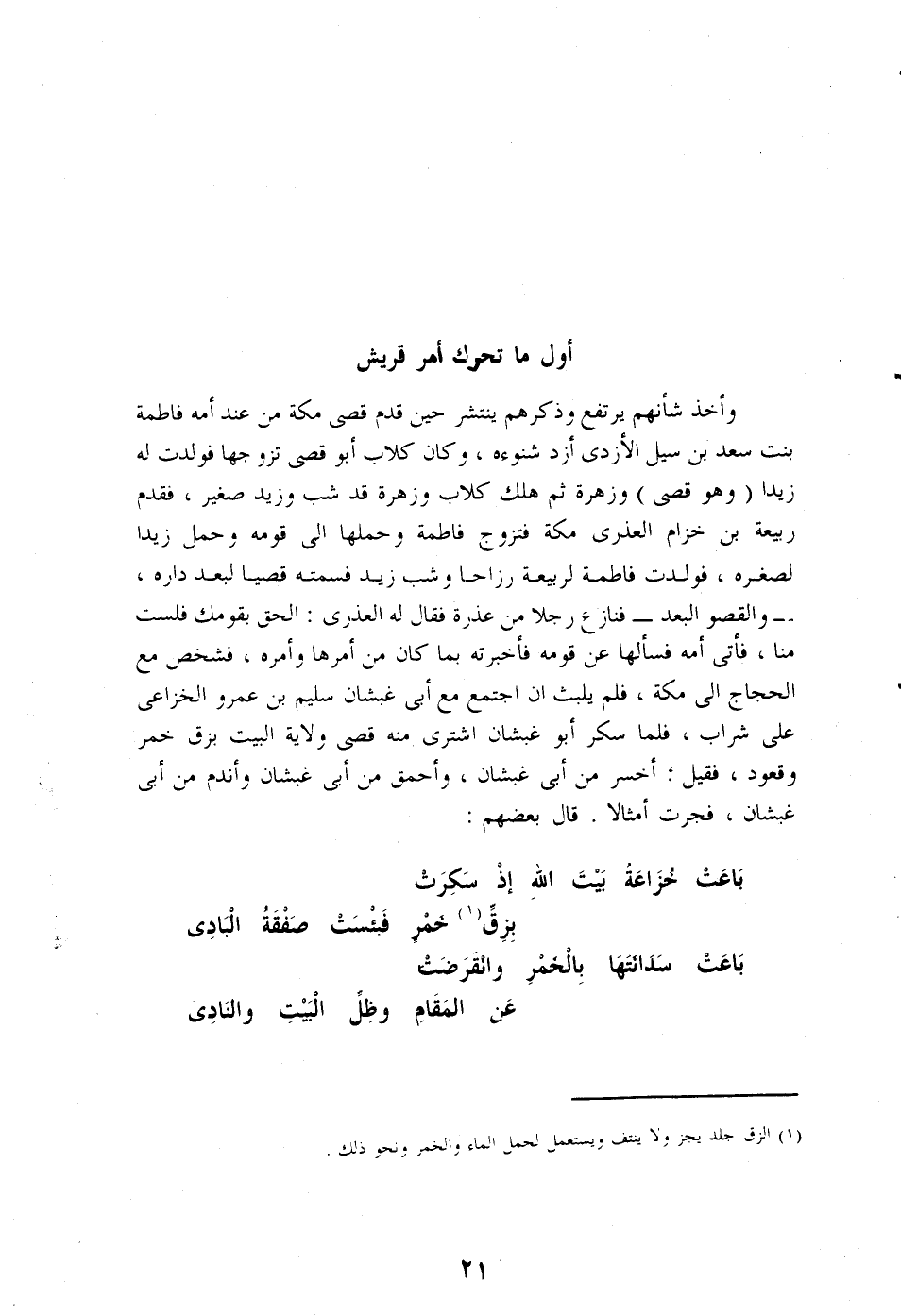وأخذ شأنهم يرتفع وذكرهم ينتشر حين قدم قصى مكة من عند أمه فاطمة بنت سعد بن سيل الأزدى أزد شنوءه، وكان كلاب أبو قصى تزوجها فولدت له زيدا (وهو قصى) وزهرة ثم هلك كلاب وزهرة قد شب وزيد صغير، فقدم ربيعة بن خزام العذرى مكة فتزوج فاطمة وحملها الى قومه وحمل زيدا لصغره، فولدت فاطمة لربيعة رزاحا وشب زيد فسمته قصيا لبعد داره،- والقصو البعد- فنازع رجلا من عذرة فقال له العذرى: الحق بقومك فلست منا، فأتى أمه فسألها عن قومه فأخبرته بما كان من أمرها وأمره، فشخص مع الحجاج الى مكة، فلم يلبث ان اجتمع مع أبى غبشان سليم بن عمرو الخزاعى على شراب، فلما سكر أبو غبشان اشترى منه قصى ولاية البيت بزق خمر وقعود، فقيل: أخسر من أبى غبشان، وأحمق من أبى غبشان وأندم من أبى غبشان، فجرت أمثالا. قال بعضهم: