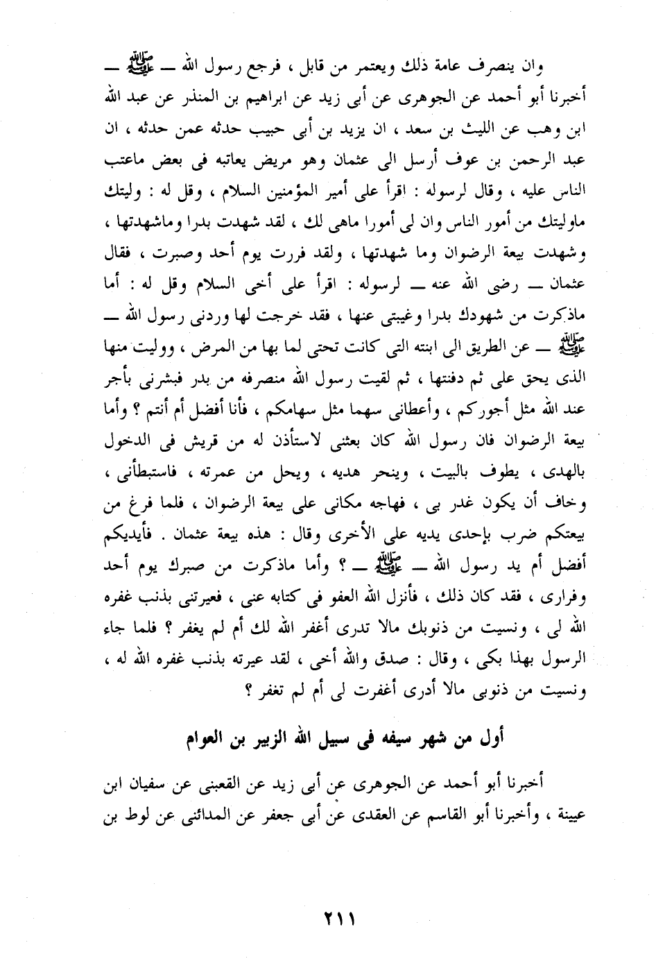 وان ينصرف عامة ذلك ويعتمر من قابل، فرجع رسول الله- صلّى الله عليه وسلم- أخبرنا أبو أحمد عن الجوهرى عن أبى زيد عن ابراهيم بن المنذر عن عبد الله ابن وهب عن الليث بن سعد، ان يزيد بن أبى حبيب حدثه عمن حدثه، ان عبد الرحمن بن عوف أرسل الى عثمان وهو مريض يعاتبه فى بعض ما عتب الناس عليه، وقال لرسوله: اقرأ على أمير المؤمنين السلام، وقل له: وليتك ما وليتك من أمور الناس وان لى أمورا ما هى لك، لقد شهدت بدرا وما شهدتها، وشهدت بيعة الرضوان وما شهدتها، ولقد فررت يوم أحد وصبرت، فقال عثمان- رضى الله عنه- لرسوله: اقرأ على أخى السلام وقل له: أما ما ذكرت من شهودك بدرا وغيبتى عنها، فقد خرجت لها وردنى رسول الله- صلّى الله عليه وسلم- عن الطريق الى ابنته التى كانت تحتى لما بها من المرض، ووليت منها الذى يحق على ثم دفنتها، ثم لقيت رسول الله منصرفه من بدر فبشرنى بأجر عند الله مثل أجوركم، وأعطانى سهما مثل سهامكم، فأنا أفضل أم أنتم؟ وأما بيعة الرضوان فان رسول الله كان بعثنى لاستأذن له من قريش فى الدخول بالهدى، يطوف بالبيت، وينحر هديه، ويحل من عمرته، فاستبطأنى، وخاف أن يكون غدر بى، فهاجه مكانى على بيعة الرضوان، فلما فرغ من بيعتكم ضرب بإحدى يديه على الأخرى وقال: هذه بيعة عثمان. فأيديكم أفضل أم يد رسول الله- صلّى الله عليه وسلم-؟ وأما ما ذكرت من صبرك يوم أحد وفرارى، فقد كان ذلك، فأنزل الله العفو فى كتابه عنى، فعيرتنى بذنب غفره الله لى، ونسيت من ذنوبك ما لا تدرى أغفر الله لك أم لم يغفر؟ فلما جاء الرسول بهذا بكى، وقال: صدق والله أخى، لقد عيرته بذنب غفره الله له، ونسيت من ذنوبى مالا أدرى أغفرت لى أم لم تغفر؟
