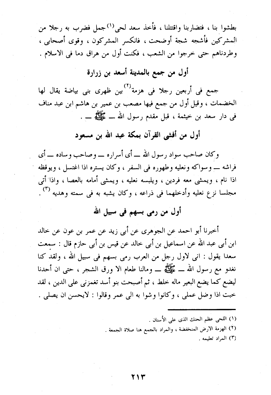 بطشوا بنا، فتضاربنا واقتتلنا، فأخذ سعد لحى «1» جمل فضرب به رجلا من المشركين فأشجه شجة أوضحت، فانكسر المشركون، وقوى أصحابى، وطردناهم حتى خرجوا من الشعب، فكنت أول من هراق دما فى الاسلام.