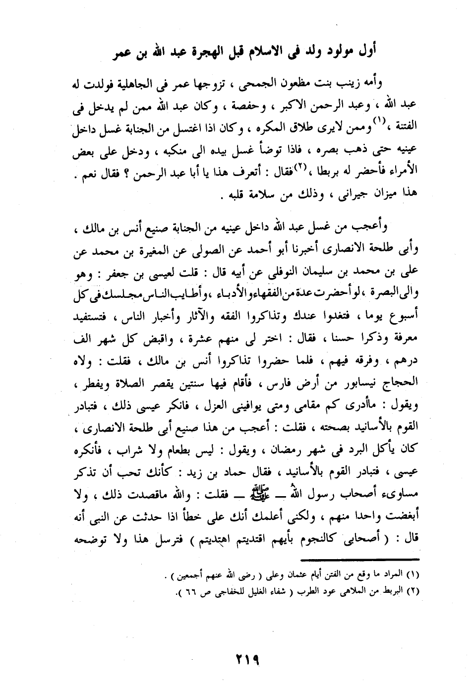 وأعجب من غسل عبد الله داخل عينيه من الجنابة صنيع أنس بن مالك، وأبى طلحة الانصارى أخبرنا أبو أحمد عن الصولى عن المغيرة بن محمد عن على بن محمد بن سليمان النوفلى عن أبيه قال: قلت لعيسى بن جعفر: وهو والى البصرة، لو أحضرت عدة من الفقهاء والأدباء، وأطايب الناس مجلسك فى كل أسبوع يوما، فتغدوا عندك وتذاكروا الفقه والآثار وأخبار الناس، فتستفيد معرفة وذكرا حسنا، فقال: اختر لى منهم عشرة، واقبض كل شهر الف درهم، وفرقه فيهم، فلما حضروا تذاكروا أنس بن مالك، فقلت: ولاه الحجاج نيسابور من أرض فارس، فأقام فيها سنتين يقصر الصلاة ويفطر، ويقول: ما أدرى كم مقامى ومتى يوافينى العزل، فانكر عيسى ذلك، فتبادر القوم بالأسانيد بصحته، فقلت: أعجب من هذا صنيع أبى طلحة الانصارى، كان يأكل البرد فى شهر رمضان، ويقول: ليس بطعام ولا شراب، فأنكره عيسى، فتبادر القوم بالأسانيد، فقال حماد بن زيد: كأنك تحب أن تذكر مساوىء أصحاب رسول الله- صلّى الله عليه وسلم- فقلت: والله ما قصدت ذلك، ولا أبغضت واحدا منهم، ولكنى أعلمك أنك على خطأ اذا حدثت عن النبى أنه قال: (أصحابى كالنجوم بأيهم اقتديتم اهتديتم) فترسل هذا ولا توضحه