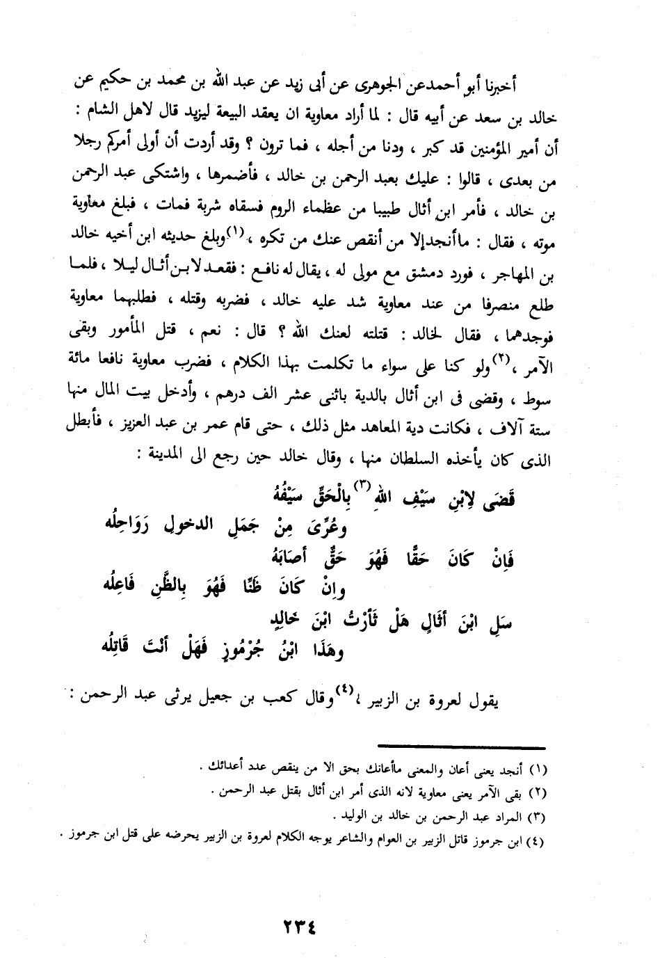 أن أمير المؤمنين قد كبر، ودنا من أجله، فما ترون؟ وقد أردت أن أولى أمركم رجلا من بعدى، قالوا: عليك بعبد الرحمن بن خالد، فأضمرها، واشتكى عبد الرحمن بن خالد، فأمر ابن أثال طبيبا من عظماء الروم فسقاه شربة فمات، فبلغ معاوية موته، فقال: ما أنجد إلا من أنقص عنك من تكره، «1» وبلغ حديثه ابن أخيه خالد بن المهاجر، فورد دمشق مع مولى له، يقال له نافع: فقعد لابن أثال ليلا، فلما طلع منصرفا من عند معاوية شد عليه خالد، فضربه وقتله، فطلبهما معاوية فوجدهما، فقال لخالد: قتلته لعنك الله؟ قال: نعم، قتل المأمور وبقى الآمر، «2» ولو كنا على سواء ما تكلمت بهذا الكلام، فضرب معاوية نافعا مائة سوط، وقضى فى ابن أثال بالدية باثنى عشر الف درهم، وأدخل بيت المال منها ستة آلاف، فكانت دية المعاهد مثل ذلك، حتى قام عمر بن عبد العزيز، فأبطل الذى كان يأخذه السلطان منها، وقال خالد حين رجع الى المدينة: