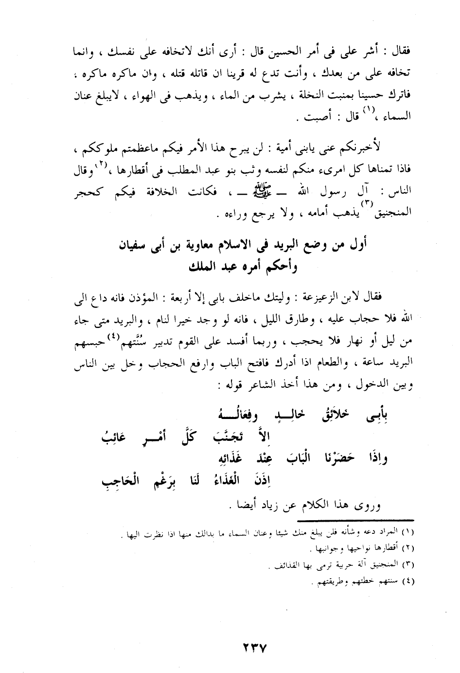 لأخبرنكم عنى يا بنى أمية: لن يبرح هذا الأمر فيكم ما عظمتم ملوككم، فاذا تمناها كل امرىء منكم لنفسه وثب بنو عبد المطلب فى أقطارها، «2» وقال الناس: آل رسول الله- صلّى الله عليه وسلم-، فكانت الخلافة فيكم كحجر المنجنيق «3» يذهب أمامه، ولا يرجع وراءه.