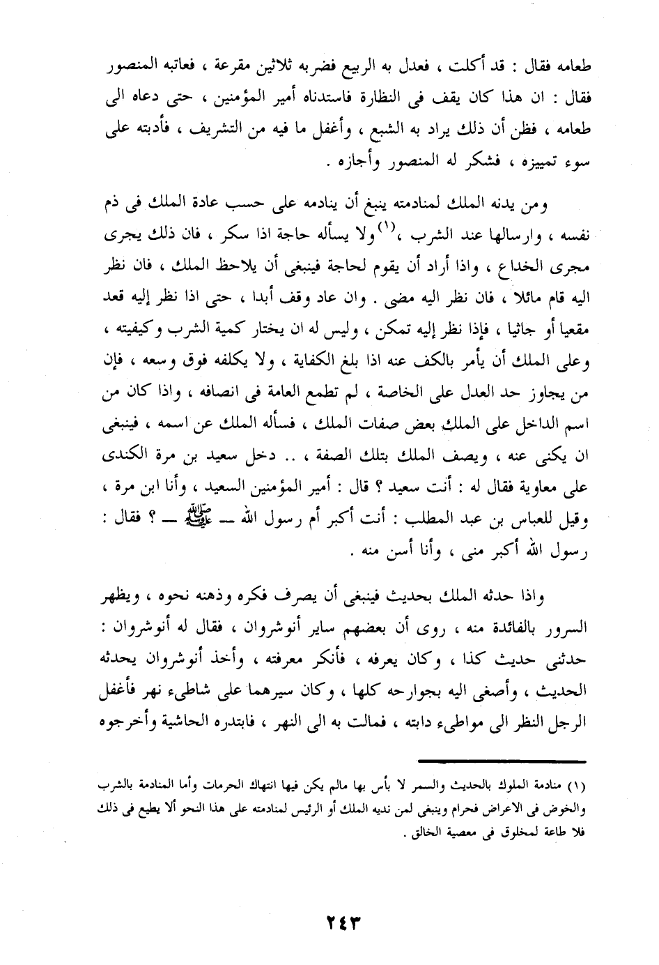 ومن يدنه الملك لمنادمته ينبغ أن ينادمه على حسب عادة الملك فى ذم نفسه، وارسالها عند الشرب، «1» ولا يسأله حاجة اذا سكر، فان ذلك يجرى مجرى الخداع، واذا أراد أن يقوم لحاجة فينبغى أن يلاحظ الملك، فان نظر اليه قام مائلا، فان نظر اليه مضى. وان عاد وقف أبدا، حتى اذا نظر إليه قعد مقعيا أو جاثيا، فإذا نظر إليه تمكن، وليس له ان يختار كمية الشرب وكيفيته، وعلى الملك أن يأمر بالكف عنه اذا بلغ الكفاية، ولا يكلفه فوق وسعه، فإن من يجاوز حد العدل على الخاصة، لم تطمع العامة فى انصافه، واذا كان من اسم الداخل على الملك بعض صفات الملك، فسأله الملك عن اسمه، فينبغى ان يكنى عنه، ويصف الملك بتلك الصفة، ... دخل سعيد بن مرة الكندى على معاوية فقال له: أنت سعيد؟ قال: أمير المؤمنين السعيد، وأنا ابن مرة، وقيل للعباس بن عبد المطلب: أنت أكبر أم رسول الله- صلّى الله عليه وسلم-؟ فقال: