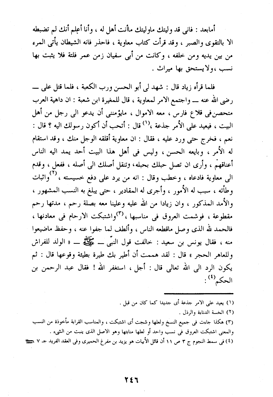 نعم، فخرج حتى ورد عليه، فقال: ان معاوية أقلقه الوجل منك، وقد استقام له الأمر، وبايعه الحسن، وليس فى أهل هذا البيت أحد يمد اليه الناس أعناقهم، وأرى ان تصل حبلك بحبله، وتنقل أصلك الى أصله، ففعل، وقدم الى معاوية فادعاه، وخطب وقال: انه من يرد على دفع خسيسته، «2» واثبات وطأته، سبب له الأمور، وأجرى له المقادير، حتى يبلغ به النسب المشهور، والأمد المذكور، وان زيادا من الله عليه وعلينا معه بصلة رحم، مدتها رحم مقطوعة، فوشمت العروق فى مناسبها، «3» واشتبكت الارحام فى معادنها، فالحمد لله الذى وصل ما قطعه الناس، وألطف لما جفوا عنه، وحفظ ما ضيعوا منه، فقال يونس بن سعيد: خالفت قول النبى- صلّى الله عليه وسلم- «الولد للفراش وللعاهر الحجر» قال: لقد هممت أن أطير بك طيرة بطيئة وقوعها قال: ثم يكون الرد الى الله تعالى قال: أجل، استغفر الله! فقال عبد الرحمن بن الحكم «4» :