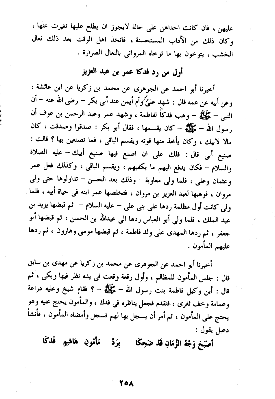 أخبرنا أبو احمد عن الجوهرى عن محمد بن زكريا عن مهدى بن سابق قال: جلس المأمون للمظالم، وأول رقعة وقعت فى يده نظر فيها وبكى، ثم قال: أين وكيل فاطمة بنت رسول الله- صلّى الله عليه وسلم-؟ فقام شيخ وعليه دراعة وعمامة وخف ثغرى، فتقدم فجعل يناظره فى فدك، والمأمون يحتج عليه وهو يحتج على المأمون، ثم أمر أن يسجل بها لهم فسجل وأمضاه المأمون، فأنشأ دعبل يقول: