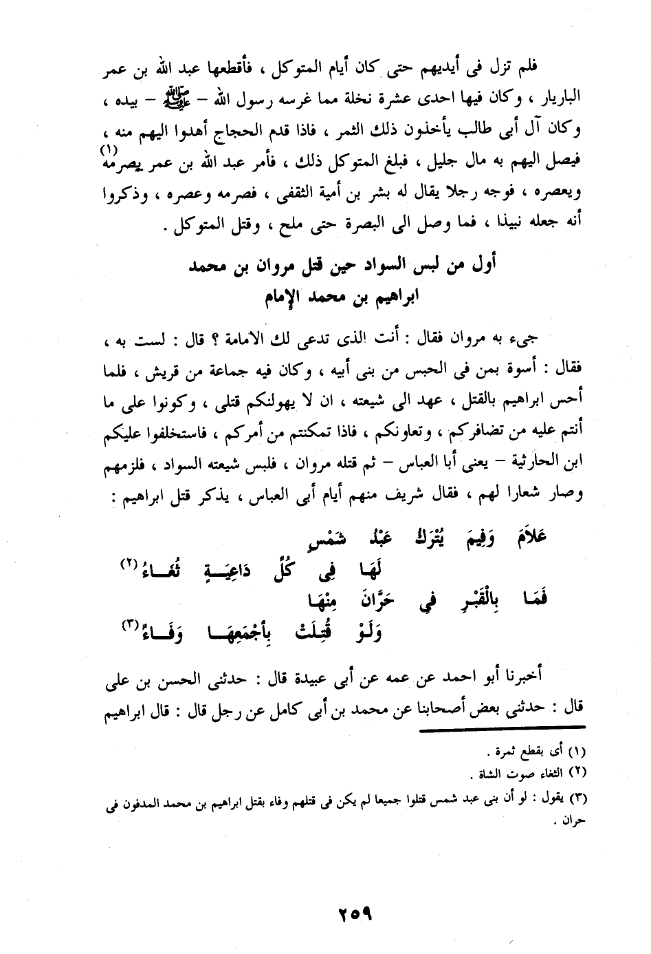 جىء به مروان فقال: أنت الذى تدعى لك الامامة؟ قال: لست به، فقال: أسوة بمن فى الحبس من بنى أبيه، وكان فيه جماعة من قريش، فلما أحس ابراهيم بالقتل، عهد الى شيعته، ان لا يهولنكم قتلى، وكونوا على ما أنتم عليه من تضافركم، وتعاونكم، فاذا تمكنتم من أمركم، فاستخلفوا عليكم ابن الحارثية- يعنى أبا العباس- ثم قتله مروان، فلبس شيعته السواد، فلزمهم وصار شعارا لهم، فقال شريف منهم أيام أبى العباس، يذكر قتل ابراهيم: