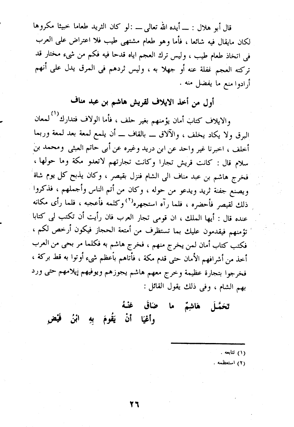 والايلاف كتاب أمان يؤمنهم بغير حلف، فأما الولاف فتدارك «1» لمعان البرق ولا يكاد يخلف، والآلاق- بالقاف- أن يلمع لمعة بعد لمعة وربما أخلف، اخبرنا غير واحد عن ابن دريد وغيره عن أبى حاتم العبثى ومحمد بن سلام قال: كانت قريش تجارا وكانت تجارتهم لا تعدو مكة وما حولها، فخرج هاشم بن عبد مناف الى الشام فنزل بقيصر، وكان يذبح كل يوم شاة ويصنع جفنة ثريد ويدعو من حوله، وكان من أتم الناس وأجملهم، فذكروا ذلك لقيصر فأحضره، فلما رآه استجهره «2» وكلمه فأعجبه، فلما رأى مكانه عنده قال: أيها الملك، ان قومي تجار العرب فان رأيت أن تكتب لى كتابا تؤمنهم فيقدمون عليك بما تستظرف من أمتعة الحجاز فيكون أرخص لكم، فكتب كتاب أمان لمن يخرج منهم، فخرج هاشم به فكلما مربحى من العرب أخذ من أشرافهم الأمان حتى قدم مكة، فأتاهم بأعظم شىء أوتوا به قط بركة، فخرجوا بتجارة عظيمة وخرج معهم هاشم يجوزهم ويوفيهم إيلامهم حتى ورد بهم الشام، وفى ذلك يقول القائل:
