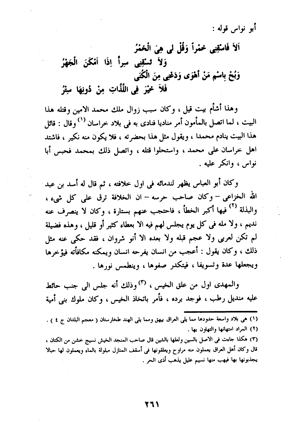 وهذا أشأم بيت قيل، وكان سبب زوال ملك محمد الامين وقتله هذا البيت، لما اتصل بالمأمون أمر مناديا فنادى به فى بلاد خراسان «1» وقال: قائل هذا البيت ينادم محمدا، ويقول مثل هذا بحضرته، فلا يكون منه نكير، فاشتد اهل خراسان على محمد، واستحلوا قتله، واتصل ذلك بمحمد فحبس أبا نواس، وانكر عليه.