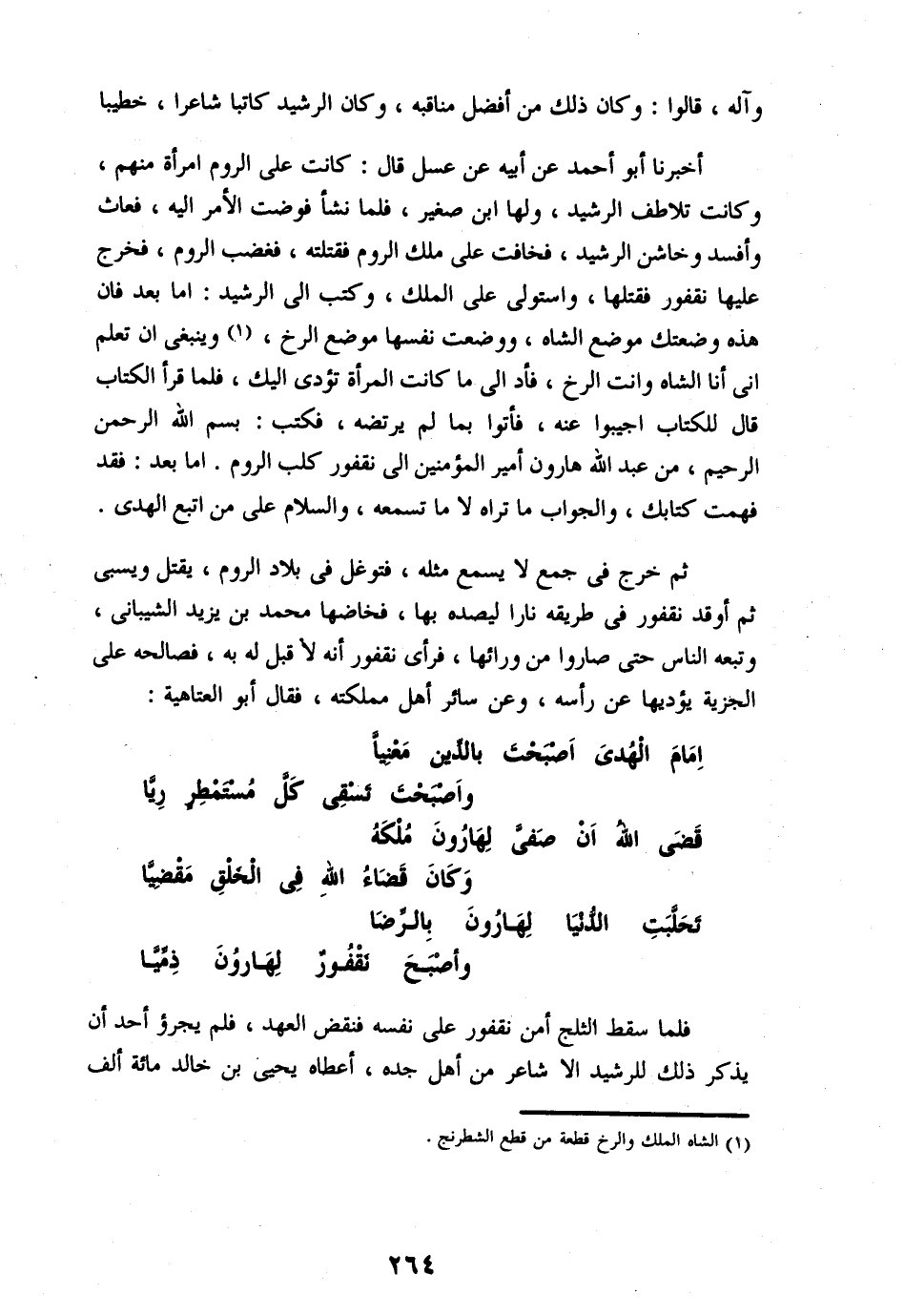 وآله، قالوا: وكان ذلك من أفضل مناقبه، وكان الرشيد كاتبا شاعرا، خطيبا أخبرنا أبو أحمد عن أبيه عن عسل قال: كانت على الروم امرأة منهم، وكانت تلاطف الرشيد، ولها ابن صغير، فلما نشأ فوضت الأمر اليه، فعاث وأفسد وخاشن الرشيد، فخافت على ملك الروم فقتلته، فغضب الروم، فخرج عليها نقفور فقتلها، واستولى على الملك، وكتب الى الرشيد: اما بعد فان هذه وضعتك موضع الشاه، ووضعت نفسها موضع الرخ، «1» وينبغى ان تعلم انى أنا الشاه وانت الرخ، فأد الى ما كانت المرأة تؤدى اليك، فلما قرأ الكتاب قال للكتاب اجيبوا عنه، فأتوا بما لم يرتضه، فكتب: بسم الله الرحمن الرحيم، من عبد الله هارون أمير المؤمنين الى نقفور كلب الروم. اما بعد: فقد فهمت كتابك، والجواب ما تراه لا ما تسمعه، والسلام على من اتبع الهدى.