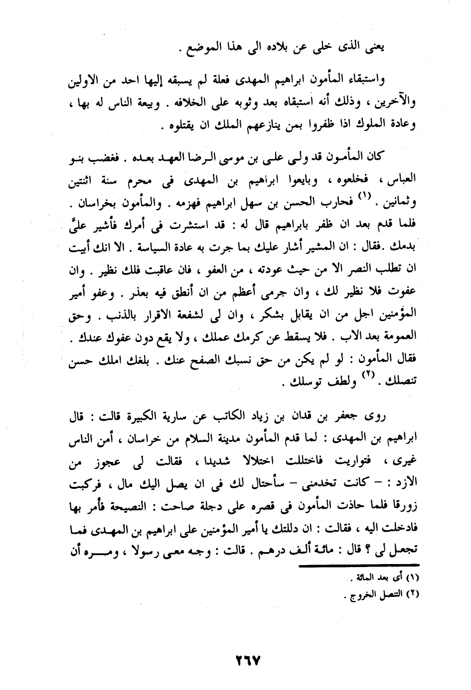 واستبقاء المأمون ابراهيم المهدى فعلة لم يسبقه إليها احد من الاولين والآخرين، وذلك أنه استبقاه بعد وثوبه على الخلافة. وبيعة الناس له بها، وعادة الملوك اذا ظفروا بمن ينازعهم الملك ان يقتلوه.