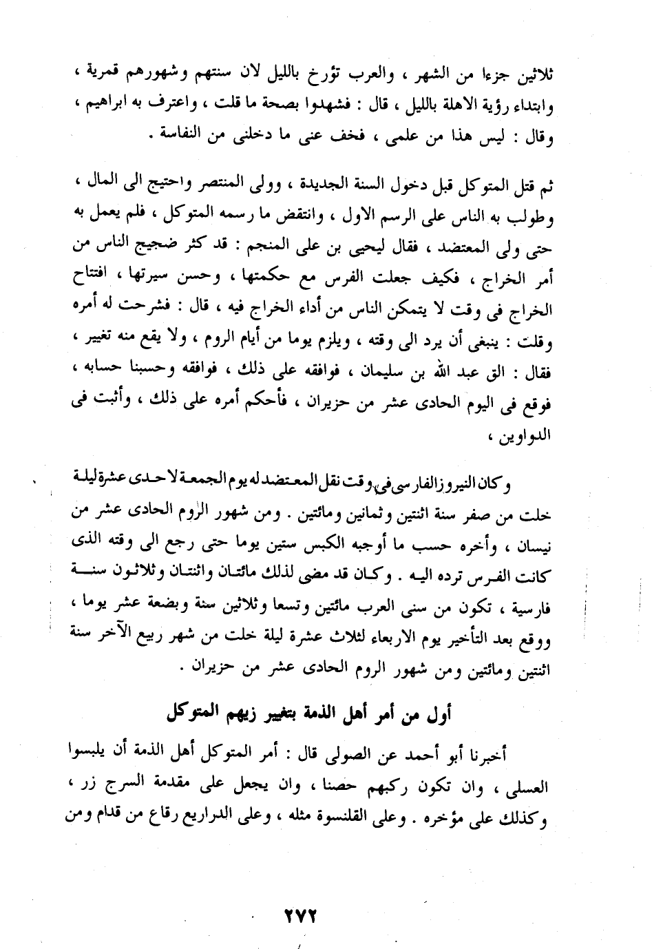 ثم قتل المتوكل قبل دخول السنة الجديدة، وولى المنتصر واحتيج الى المال، وطولب به الناس على الرسم الاول، وانتقض ما رسمه المتوكل، فلم يعمل به حتى ولى المعتضد، فقال ليحيى بن على المنجم: قد كثر ضجيج الناس من أمر الخراج، فكيف جعلت الفرس مع حكمتها، وحسن سيرتها، افتتاح الخراج فى وقت لا يتمكن الناس من أداء الخراج فيه، قال: فشرحت له أمره وقلت: ينبغى أن يرد الى وقته، ويلزم يوما من أيام الروم، ولا يقع منه تغيير، فقال: الق عبد الله بن سليمان، فوافقه على ذلك، فوافقه وحسبنا حسابه، فوقع فى اليوم الحادى عشر من حزيران، فأحكم أمره على ذلك، وأثبت فى الدواوين، وكان النيروز الفارسى فى وقت نقل المعتضد له يوم الجمعة لاحدى عشرة ليلة خلت من صفر سنة اثنتين وثمانين ومائتين. ومن شهور الروم الحادى عشر من نيسان، وأخره حسب ما أوجبه الكبس ستين يوما حتى رجع الى وقته الذى كانت الفرس ترده اليه. وكان قد مضى لذلك مائتان واثنتان وثلاثون سنة فارسية، تكون من سنى العرب مائتين وتسعا وثلاثين سنة وبضعة عشر يوما، ووقع بعد التأخير يوم الاربعاء لثلاث عشرة ليلة خلت من شهر ربيع الآخر سنة اثنتين ومائتين ومن شهور الروم الحادى عشر من حزيران.