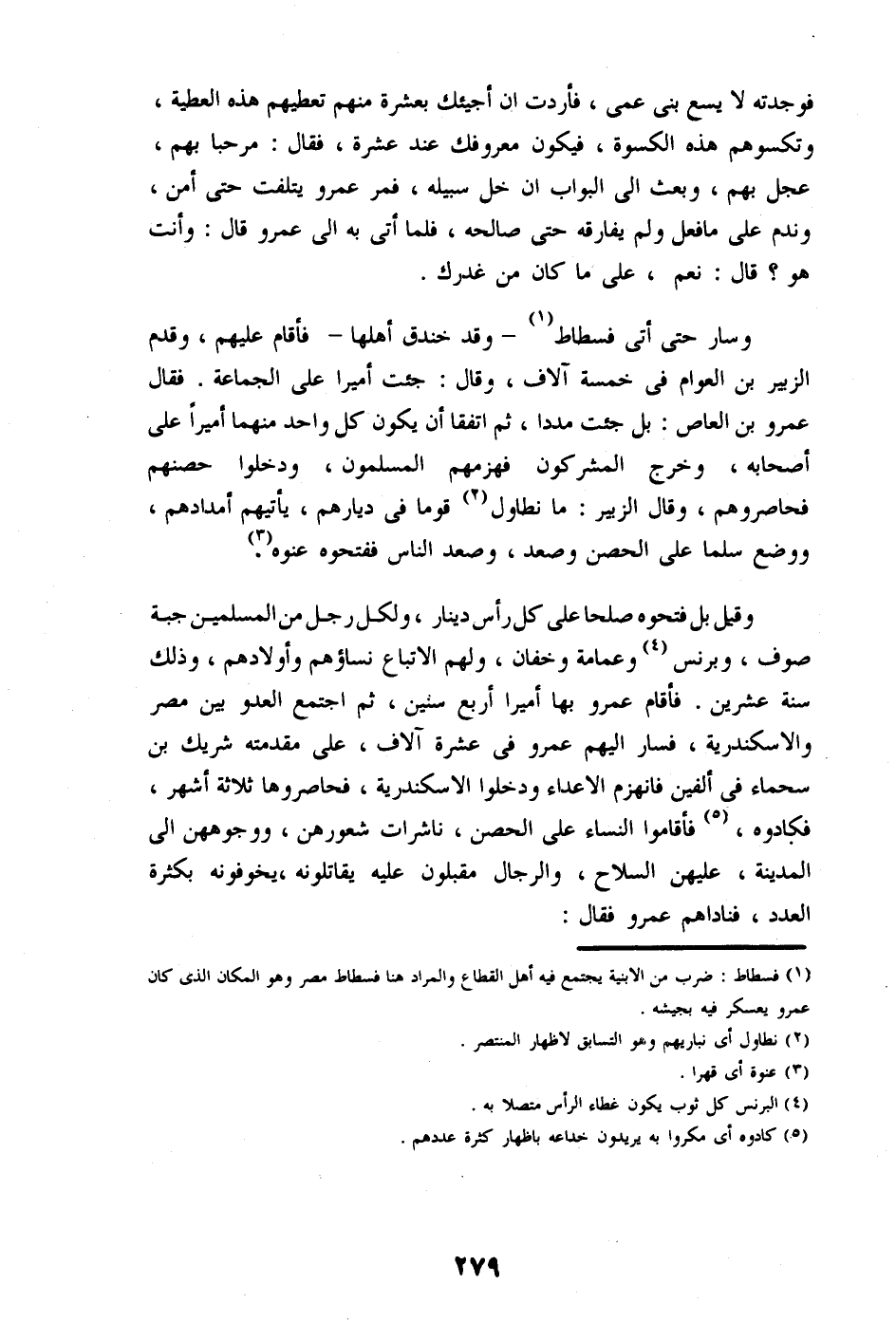 وسار حتى أتى فسطاط «1» - وقد خندق أهلها- فأقام عليهم، وقدم الزبير بن العوام فى خمسة آلاف، وقال: جئت أميرا على الجماعة. فقال عمرو بن العاص: بل جئت مددا، ثم اتفقا أن يكون كل واحد منهما أميرا على أصحابه، وخرج المشركون فهزمهم المسلمون، ودخلوا حصنهم فحاصروهم، وقال الزبير: ما نطاول «2» قوما فى ديارهم، يأتيهم أمدادهم، ووضع سلما على الحصن وصعد، وصعد الناس ففتحوه عنوه. «3»
