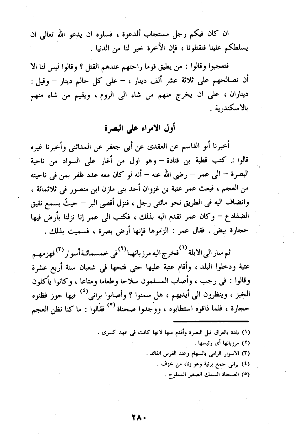 أخبرنا أبو القاسم عن العقدى عن أبى جعفر عن المدائنى وأخبرنا غيره قالوا: كتب قطبة بن قتادة- وهو اول من أغار على السواد من ناحية البصرة- الى عمر- رضى الله عنه- أنه لو كان معه عدد ظفر بمن فى ناحيته من العجم، فبعث عمر عتبة بن غزوان أحد بنى مازن ابن منصور فى ثلاثمائة، وانضاف اليه فى الطريق نحو مائتى رجل، فنزل أقصى البر- حيث يسمع نقيق الضفادع- وكان عمر تقدم اليه بذلك، فكتب الى عمر إنا نزلنا بأرض فيها حجارة بيض. فقال عمر: الزموها فإنها أرض بصرة، فسميت بذلك.