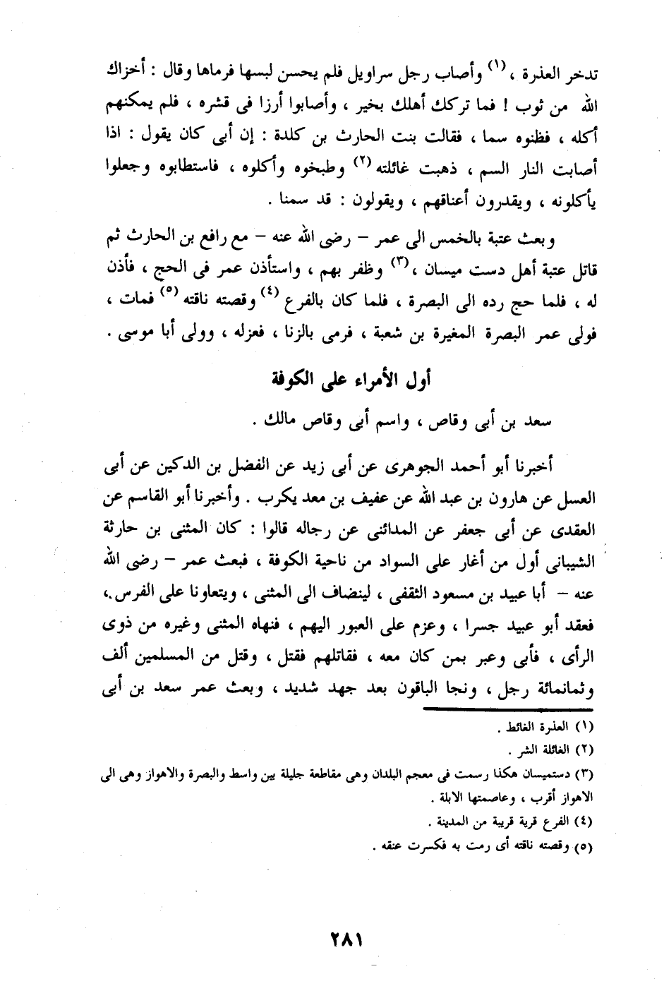 وبعث عتبة بالخمس الى عمر- رضى الله عنه- مع رافع بن الحارث ثم قاتل عتبة أهل دست ميسان، «3» وظفر بهم، واستأذن عمر فى الحج، فأذن له، فلما حج رده الى البصرة، فلما كان بالفرع «4» وقصته ناقته «5» فمات، فولى عمر البصرة المغيرة بن شعبة، فرمى بالزنا، فعزله، وولى أبا موسى.