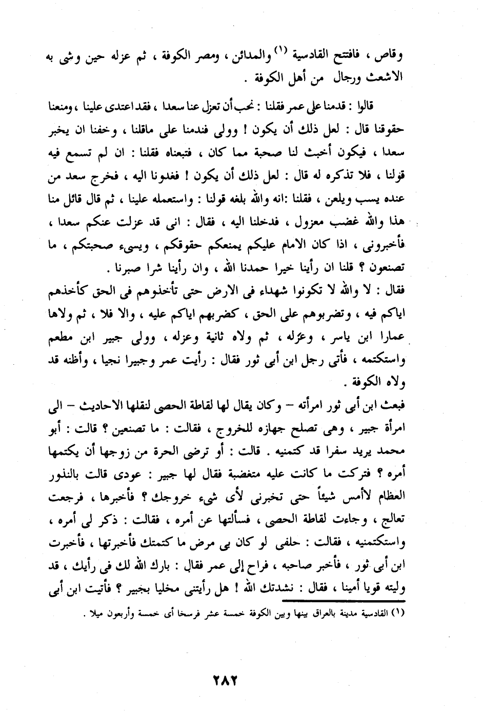قالوا: قدمنا على عمر فقلنا: نحب أن تعزل عنا سعدا، فقد اعتدى علينا، ومنعنا حقوقنا قال: لعل ذلك أن يكون! وولى فندمنا على ما قلنا، وخفنا ان يخبر سعدا، فيكون أخبث لنا صحبة مما كان، فتبعناه فقلنا: ان لم تسمع فيه قولنا، فلا تذكره له قال: لعل ذلك أن يكون! فغدونا اليه، فخرج سعد من عنده يسب ويلعن، فقلنا: انه والله بلغه قولنا: واستعمله علينا، ثم قال قائل منا هذا والله غضب معزول، فدخلنا اليه، فقال: انى قد عزلت عنكم سعدا، فأخبرونى، اذا كان الامام عليكم يمنعكم حقوقكم، ويسىء صحبتكم، ما تصنعون؟ قلنا ان رأينا خيرا حمدنا الله، وان رأينا شرا صبرنا.