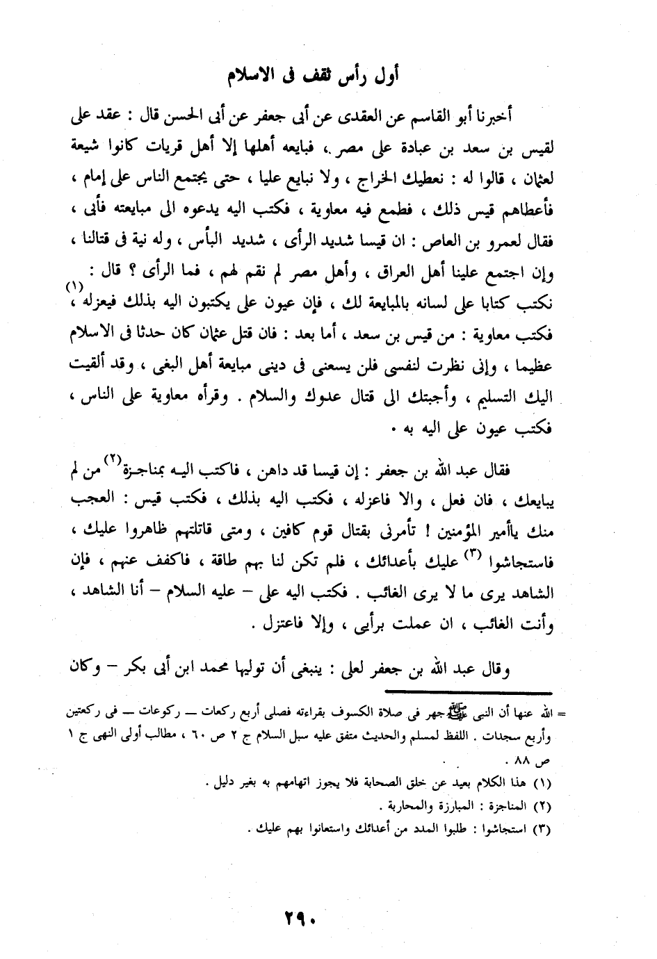 أخبرنا أبو القاسم عن العقدى عن أبى جعفر عن أبى الحسن قال: عقد على لقيس بن سعد بن عبادة على مصر، فبايعه أهلها إلا أهل قريات كانوا شيعة لعثمان، قالوا له: نعطيك الخراج، ولا نبايع عليا، حتى يجتمع الناس على إمام، فأعطاهم قيس ذلك، فطمع فيه معاوية، فكتب اليه يدعوه الى مبايعته فأبى، فقال لعمرو بن العاص: ان قياس شديد الرأى، شديد البأس، وله نية فى قتالنا، وإن اجتمع علينا أهل العراق، وأهل مصر لم نقم لهم، فما الرأى؟ قال: