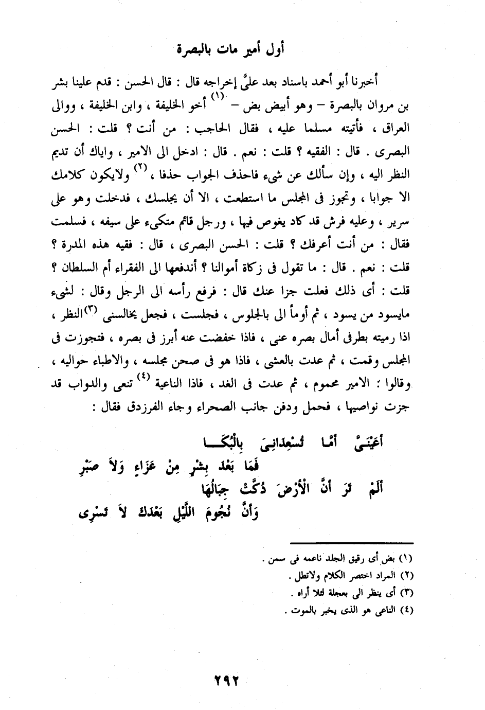 قلت: أى ذلك فعلت جزا عنك قال: فرفع رأسه الى الرجل وقال: لشىء ما يسود من يسود، ثم أومأ الى بالجلوس، فجلست، فجعل يخالسنى «3» النظر، اذا رميته بطرفى أمال بصره عنى، فاذا خفضت عنه أبرز فى بصره، فتجوزت فى المجلس وقمت، ثم عدت بالعشى، فاذا هو فى صحن مجلسه، والاطباء حواليه، وقالوا: الامير محموم، ثم عدت فى الغد، فاذا الناعية «4» تنعى والدواب قد جزت نواصيها، فحمل ودفن جانب الصحراء وجاء الفرزدق فقال: