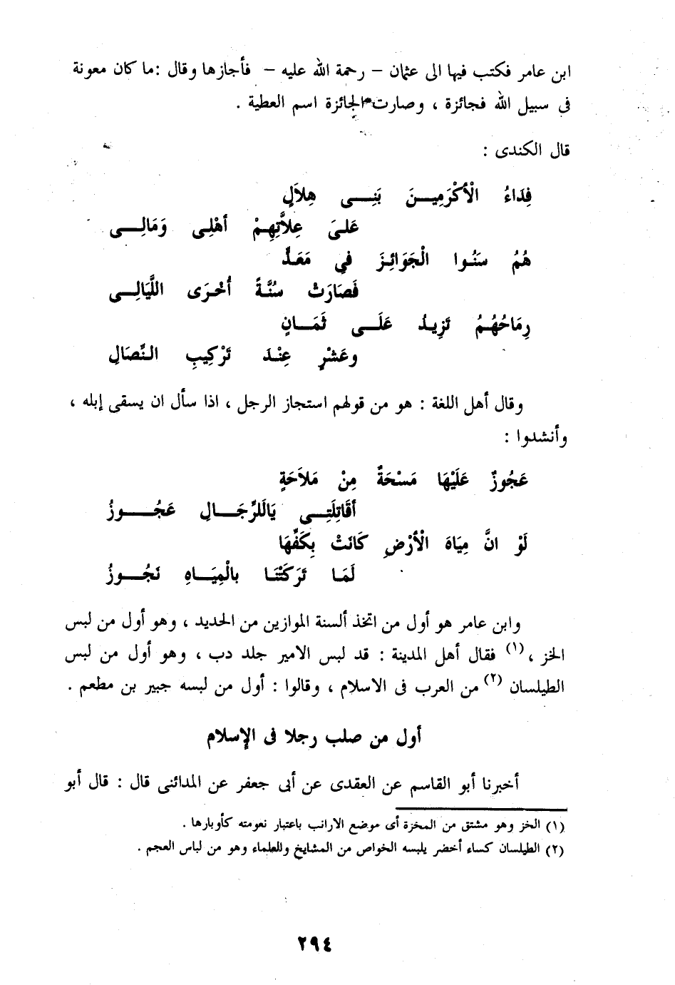 وابن عامر هو أول من اتخذ ألسنة الموازين من الحديد، وهو أول من لبس الخز، «1» فقال أهل المدينة: قد لبس الامير جلد دب، وهو أول من لبس الطيلسان «2» من العرب فى الاسلام، وقالوا: أول من لبسه جبير بن مطعم.