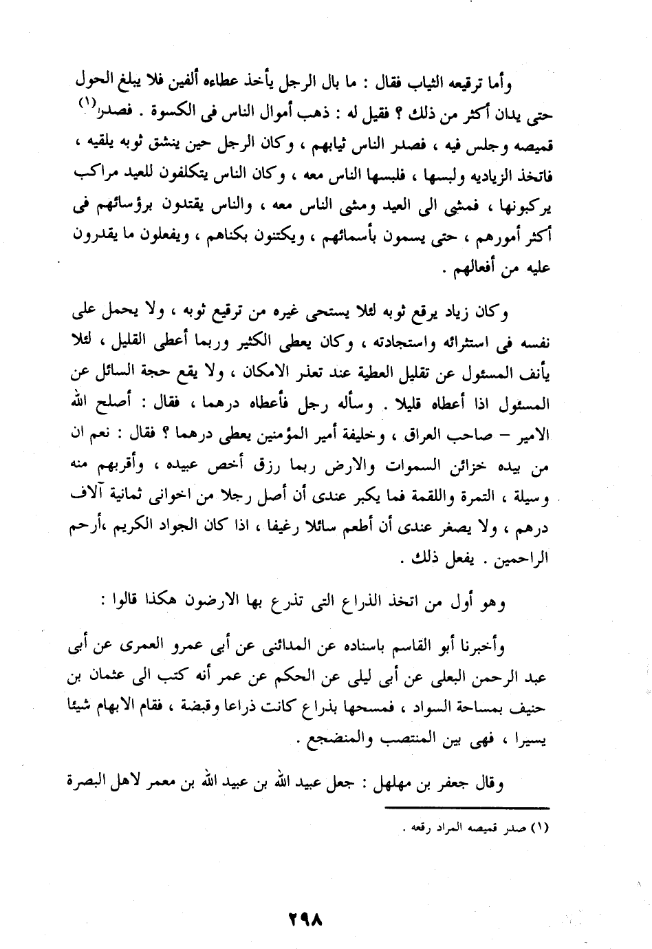 وأما ترقيعه الثياب فقال: ما بال الرجل يأخذ عطاءه ألفين فلا يبلغ الحول حتى يدان أكثر من ذلك؟ فقيل له: ذهب أموال الناس فى الكسوة. فصدر «1» قميصه وجلس فيه، فصدر الناس ثيابهم، وكان الرجل حين ينشق ثوبه يلقيه، فاتخذ الزياديه ولبسها، فلبسها الناس معه، وكان الناس يتكلفون للعيد مراكب يركبونها، فمشى الى العيد ومشى الناس معه، والناس يقتدون برؤسائهم فى أكثر أمورهم، حتى يسمون بأسمائهم، ويكتنون بكناهم، ويفعلون ما يقدرون عليه من أفعالهم.